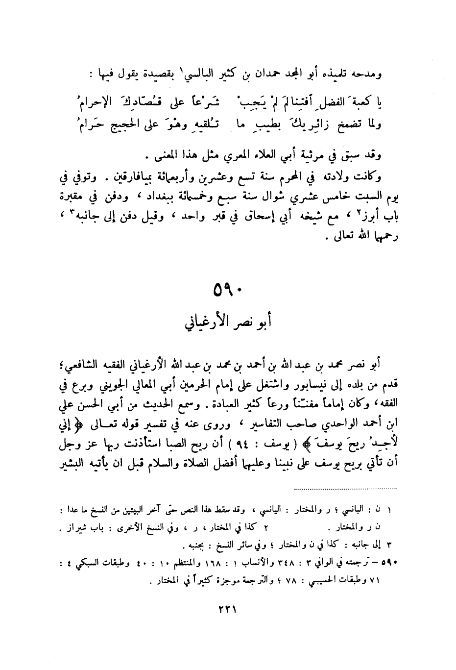 أبو نصر محمد بن عبد الله بن أحمد بن محمد بن عبد الله الأرغياني الفقيه الشافعي، قدم من بلده إلى نيسابور واشتغل على إمام الحرمين أبي المعالي الجويني وبرع في الفقه، وكان إماما مفننا ورعا كثير العبادة. وسمع الحديث من أبي الحسن علي ابن أحمد الواحدي صاحب التفاسير، وروى عنه في تفسير قوله تعالى: (إني لأجد ريح يوسف) ، أن ريح الصبا استاذنت ربها عز وجل أن تأتي بريح يوسف على نبينا وعليهما أفضل الصلاة والسلام قبل أن يأتيه البشير