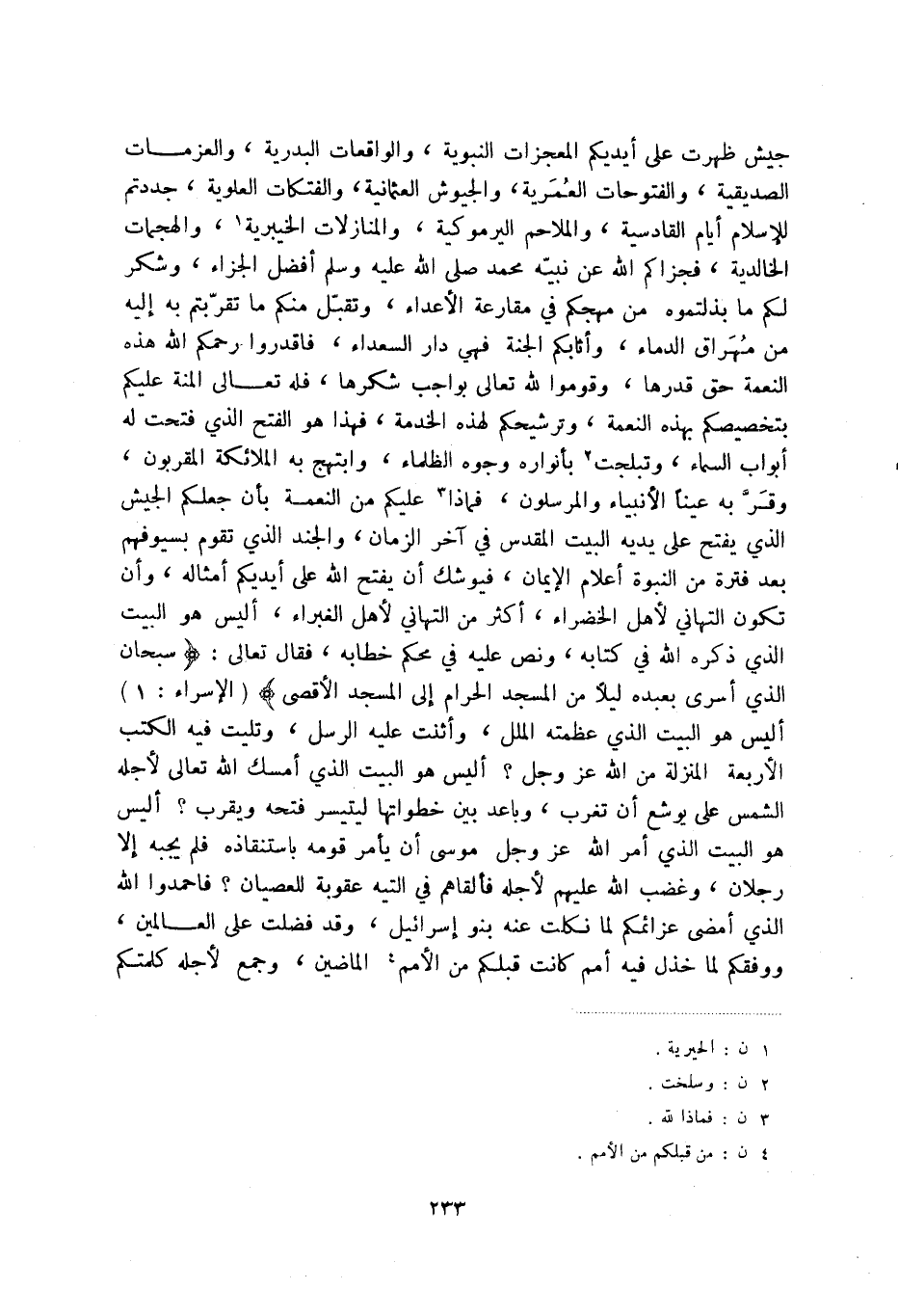 جيش ظهرت على أيديكم المعجزات النبوية، والواقعات البدرية، والعزمات الصديقية، والفتوحات العمرية، والجيوش العثماني، والفتكات العلوية، جددتم للإسلام أيام القادسية، والملاحم اليرموكية، والمنازلات الخيبرية (1) ، والهجمات الخالدية، فجزاكم الله عن نبيه محمد صلى الله عليه وسلم أفضل الجزاء، وشكر لكم ما بذلتموه من مهجكم في مقارعة الأعداء، وتقبل منكم ما تقربتم به إليه من مهراق الدماء، وأثابكم الجنة فهي دار السعداء، فاقدروا رحمكم الله هذه النعمة حق قدرها، وقوموا لله تعالى بواجب شكرها، فله تعالى المنة عليكم بتخصيصكم بهذه النعمة، وترشيحكم لهذه الخدمة، فهذا هو الفتح الذي فتحت له أبواب السناء، وتبلجت (2) بأنواره وجوه الظلماء، وابتهج به الملائكة المقربون، وقر به عينا الأنبياء والمرسلون، فماذا (3) عليكم من النعمة بأن جعلكم الجيش الذي يفتح على يديه البيت المقدس في آخر الزمان، والجند الذي تقوم بسيوفهم بعد فترة من النبوة أعلام الإيمان، فيوشك أن يفتح الله على أيديكم أمثاله، وأن تكون التهاني لأهل الخضراء، أكثر من التهاني لأهل الغبراء، أليس هو البيت الذي ذكره الله في كتابه، ونص عليه في محكم خطابه، فقال تعالى: (سبحان الذي أسرى بعبده ليلا من المسجد الحرام إلى المسجد الأقصى) ، أليس هو البيت الذي عظمته الملل، وأثنت عليه الرسل، وتليت فيه الكتب الأربعة المنزلة من الله عز وجل أليس هو البيت الذي أمسك الله تعالى لأجله الشمس على يوشع أن تغرب، وباعد بين خطواتها ليتيسر فتحه ويقرب أليس هو البيت الذي أمر الله عز وجل موسى أن يأمر قومه باستنقاذه فلم يجبه إلا رجلان، وغضب الله عليهم لأجله فألقاهم في التيه عقوبة للعصيان فاحمدوا الله الذي أمضى عزائمكم لما نكلت عنه بنو إسرائيل، وقد فضلت على العالمين، ووفقكم لما خذل فيه أمم كانت قبلكم من الأمم (4) الماضين، وجمع لأجله كلمتكم