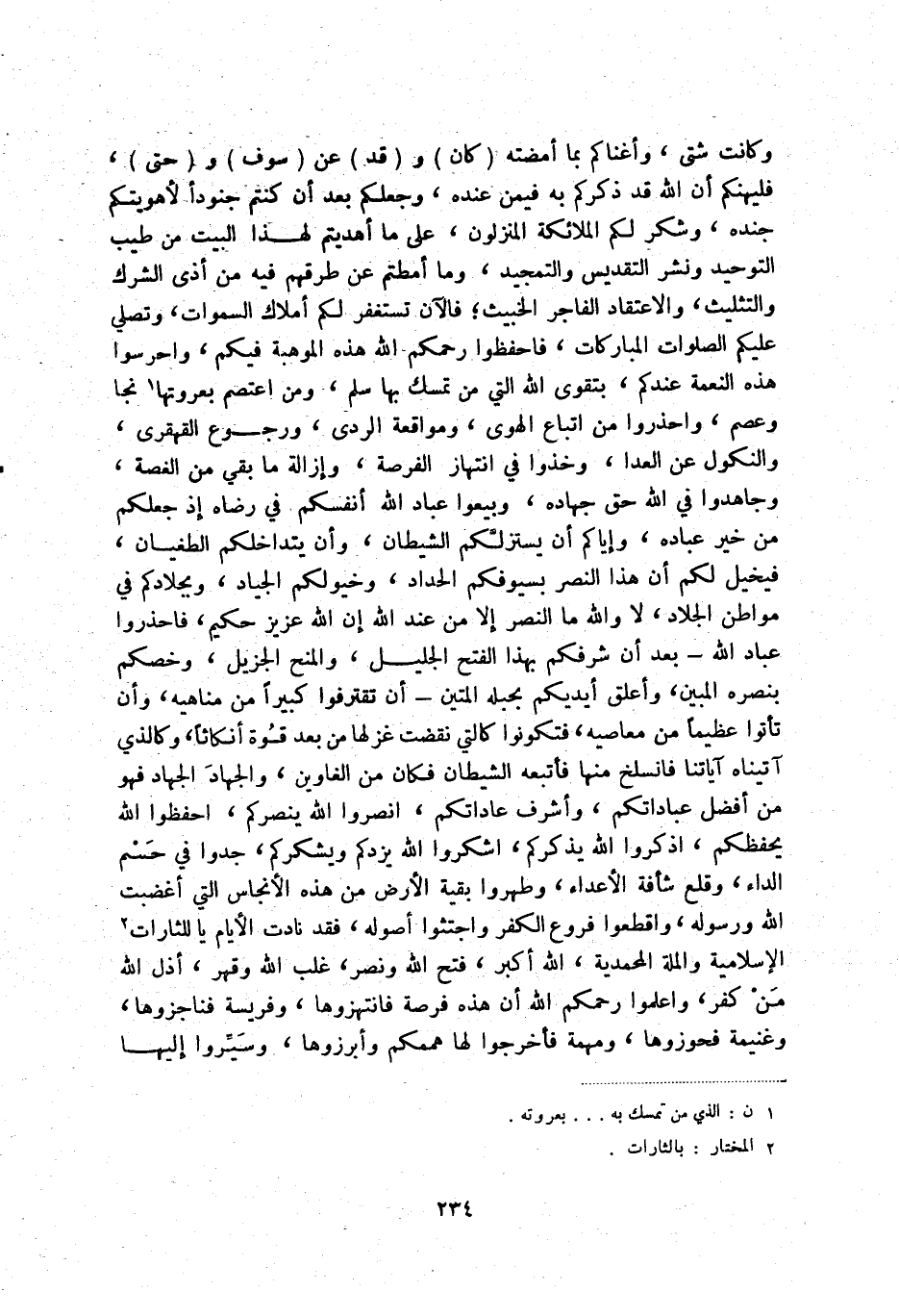 وكانت شتى، وأغناكم بما أمضته كان وقد عن سوف وحتى، فليهنكم أن الله قد ذكركم به فيمن عنده، وجعلكم بعد أن كنتم جنودا لأهويتكم جنده، وشكر لكم الملائكة المنزلون، على ما أهديتم لهذا البيت من طيب التوحيد ونشر التقديس والتمجيد، وما أمطتم عن طرقهم فيه من أذى الشرك والتثليث، والاعتقاد الفاجر الخبيث، فالآن تستغفر لكم أملاك السموات، وتصلي عليكم الصلوات المباركات، فاحفظوا رحمكم الله هذه الموهبة فيكم، واحرسوا هذه النعمة عندكم، بتقوى الله التي من تمسك بها سلم، ومن اعتصم بعروتها (1) نجا وعصم، واحذروا من اتباع الهوى، ومواقعة الردى، ورجوع القهقرى، والنكول عن العدا، وخذوا في انتهاز الفرصة، وإزالة ما بقي من الغصة، وجاهدوا في الله حق جهاده، وبيعوا عباد الله أنفسكم في رضاه إذ جعلكم من خير عباده، وإياكم أن يستزلكم الشيطان، وأن يتداخلكم الطغيان، فيخيل لكم أن هذا النصر بسيوفكم الحداد، وخيولكم الجياد، وبجلادكم في مواطن الجلاد، لا والله ما النصر إلا من عند الله إن الله عزيز حكيم، فاحذروا عباد الله - بعد أن شرفكم بهذا الفتح الجليل، والمنح الجزيل، وخصكم بنصره المبين، وأعلق أيديكم بحبله المتين - أن تقترفوا كبيرا من مناهيه، وأن تأتوا عظيما من معاصيه، فتكونوا كالتي نقضت غزلها من بعد قوة أنكاثا، وكالذي آتيناه آياتنا فانسلخ منها فأتبعه الشيطان فكان من الغاوين، والجهاد الجهاد فهو من أفضل عباداتكم، وأشرف عاداتكم، انصروا الله ينصركم، احفظوا الله يحفظكم، اذكروا الله يذكركم، اشكروا الله يزدكم ويشكركم، جدوا في حسم الداء، وقلع شأفة الأعداء، وطهروا بقية الأرض من هذه الأنجاس التي أغضبت الله ورسوله، واقطعوا فروع الكفر واجتثوا أصوله، فقد نادت الأيام يا للثارات (2) الإسلامية والملة المحمدية، الله أكبر، فتح الله ونصر، غلب الله وقهر، أذل الله من كفر، واعلموا رحمكم الله أن هذه فرصة فانتهزوها، وفريسة فناجزوها، وغنيمة فحوزوها، ومهمة فأخرجوا لها هممكم وأبرزوها، وسيروا إليها