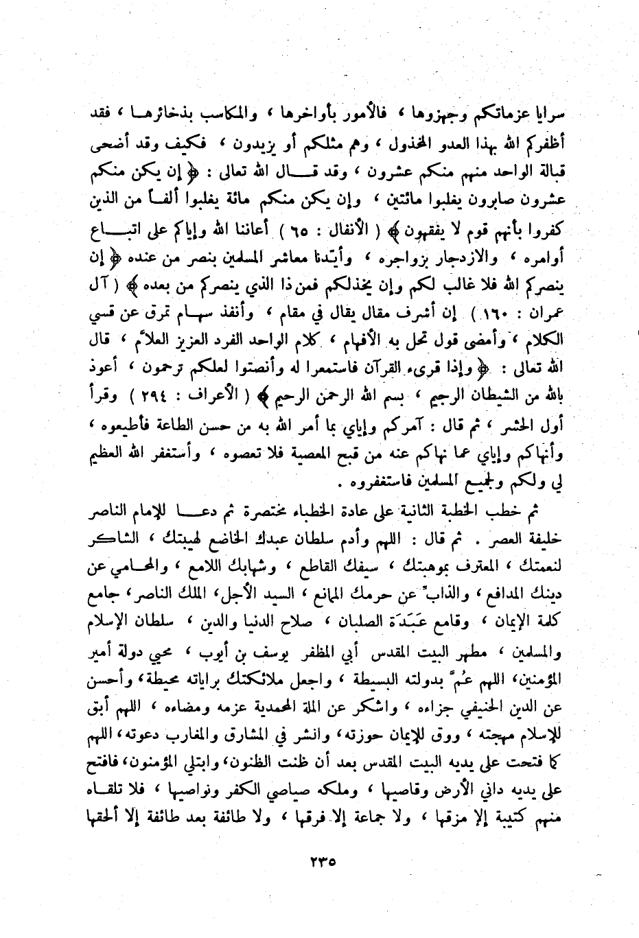 سرايا عزماتكم وجهزوها، فالأمور بأواخرها، والمكاسب بذخائرها، فقد أظفركم الله بهذا العدو المخذول، وهم مثلكم أو يزيدون، فكيف وقد أضحى قبالة الواحد منهم منكم عشرون، وقد قال الله تعالى: (إن يكن منكم عشرون صابرون يغلبوا مائتين، وإن يكن منكم مائة يغلبوا ألفا من الذين كفروا بأنهم قوم لا يفقهون) ، أعاننا الله وإياكم على اتباع أوامره، والازدجار بزواجره، وأيدنا معاشر المسلمين بنصر من عنده (إن ينصركم الله فلا غالب لكم وإن يخذلكم فمن ذا الذي ينصركم من بعده) ، إن أشرف مقال يقال في مقام، وأنفذ سهام تمرق عن قسي الكلام، وأمضى قول تحل به الأفهام، كلام الواحد الفرد العزيز العلام، قال الله تعالى: (وإذا قرئ القرآن فاستمعوا له وأنصتوا لعلكم ترحمون، أعوذ بالله من الشيطان الرجيم، بسم الله الرحمن الرحيم) ، وقرأ أول الحشر، ثم قال: آمركم وإياي بما أمر به من حسن الطاعة فأطيعوه، وأنهاكم وإياي عما نهاكم عنه من قبح المعصية فلا تعصوه، وأستغفر الله العظيم لي ولكم ولجميع المسلمين فاستغفروه.