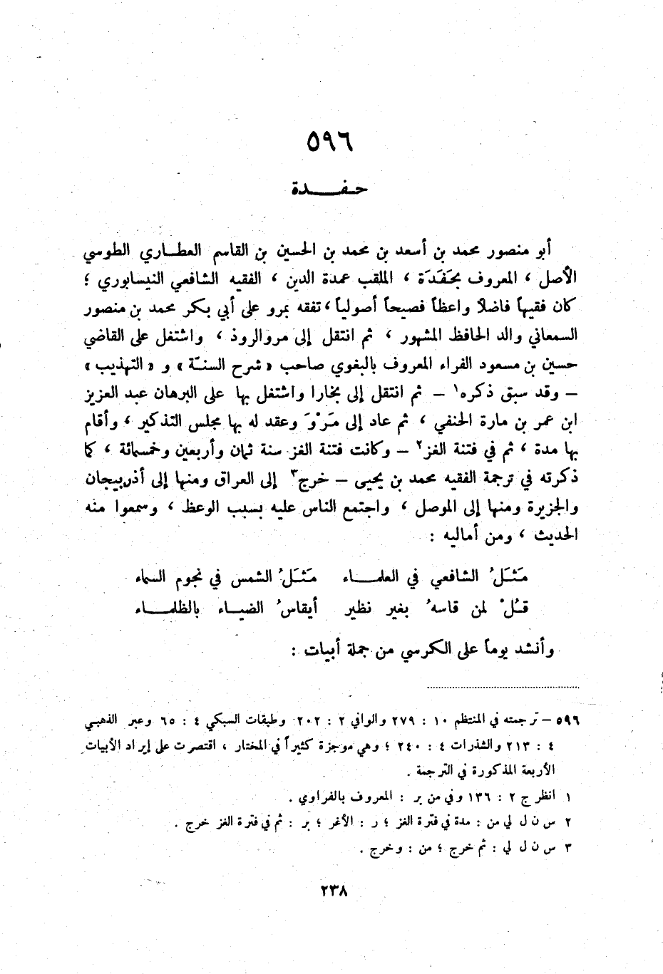 (1) ترجمته في المنتظم 10: 279 والوافي 2: 202 وطبقات السبكي 4: 65 وعبر الذهبي 4: 213 والشذرات 4: 240؛ وهي موجزة كثيراً في المختار، اقتصرص على إيراد الأبيات الأربعة المذكورة في الترجمة.