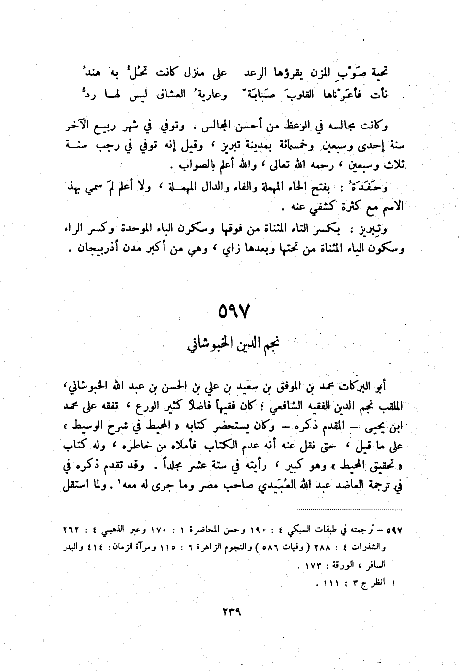 أبو البركات محمد بن الموفق بن سعيد بن علي بن الحسن بن عبد الله الخبوشاني، الملقب نجم الدين الفقيه الشافعي، كان فقيها فاضلا كثير الورع، تفقه على محمد ابن يحيى - المقدم ذكره - وكان يستحضر كتابه المحيط في شرح الوسيط على ما قيل، حتى نقل عنه أنه عدم الكتاب فأملاه من خاطره، وله كتاب تحقيق المحيط وهو كبير، رأيته في ستة عشر مجلدا. وقد تقدم ذكره في ترجمة العاضد عبد الله العبيدي صاحب مصر وما جرى له معه (2) . ولما استقل