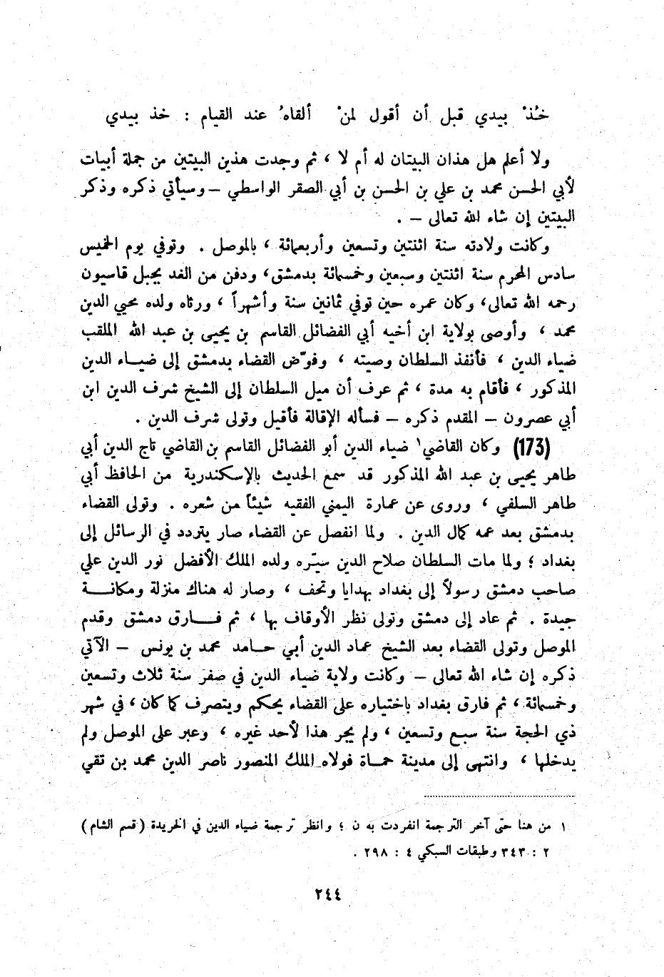 (1) من هنا حتى آخر الترجمة انفردت به ن؛ وانظر ترجمة ضياء الدين في الخريدة (قسم الشام) 2: 343 وطبقات السبكي 4: 298.