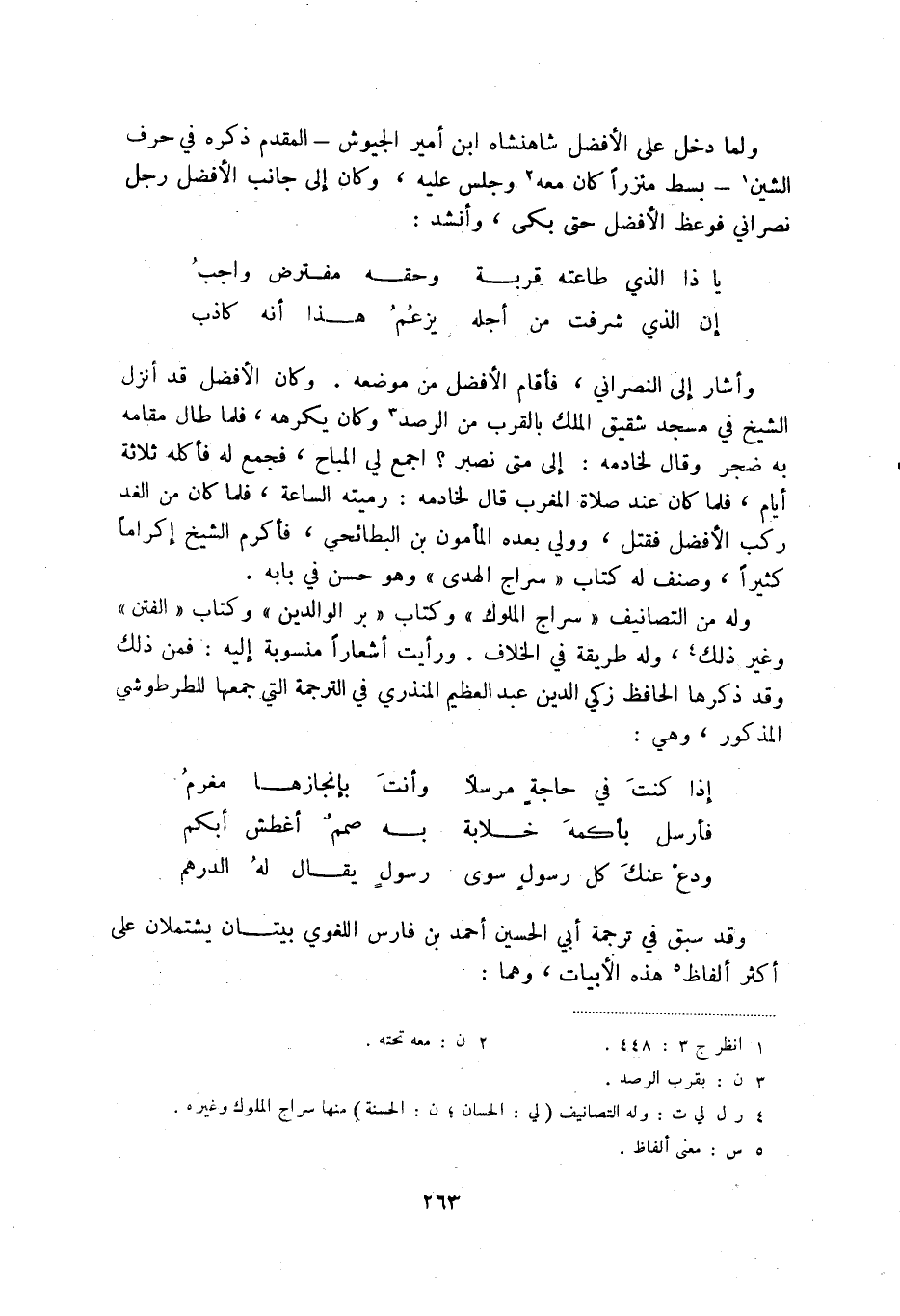 ولما دخل على الأفضل شاهنشاه ابن امير الجيوش - المقدم ذكره في حرف الشين (1) - بسط مئزرا كان معه (2) وجلس عليه، وكان إلى جانب الأفضل رجل نصراني فوعظ الأفضل حتى بكى، وأنشد: