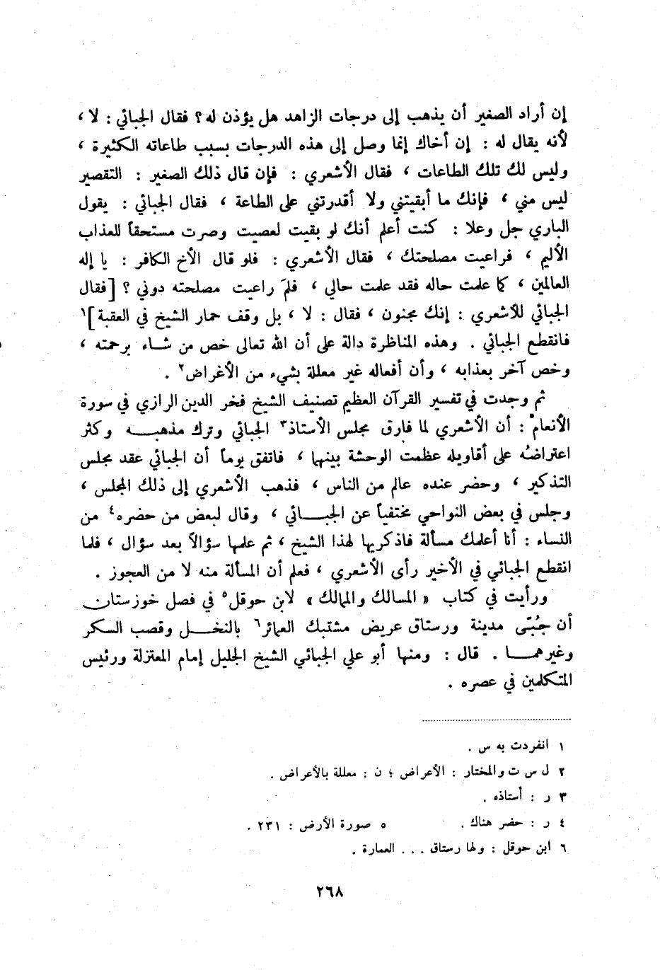 ثم وجدت في تفسير القرآن العظيم تصنيف الشيخ فخر الدين الرازي في سورة الأنعام: أن الأشعري لما فارق مجلس الأستاذ (3) الجبائي وترك مذهبه وكثر اعتراضه على أقاويله عظمت الوحشة بينهما، فاتفق يوما أن الجبائي عقد مجلس التذكير، وحضر عنده عالم من الناس، فذهب الأشعري إلى ذلك المجلس، وجلس في بعض النواحي مختفيا عن الجبائي، وقال لبعض من حضره (4) من النساء: أنا أعلمك مسألة فاذكريها لهذا الشيخ، ثم علمها سؤالا بعد سؤال، فلما انقطع الجبائي في الأخير رأى الأشعري، فعلم أن المسألة منه لا من العجوز.