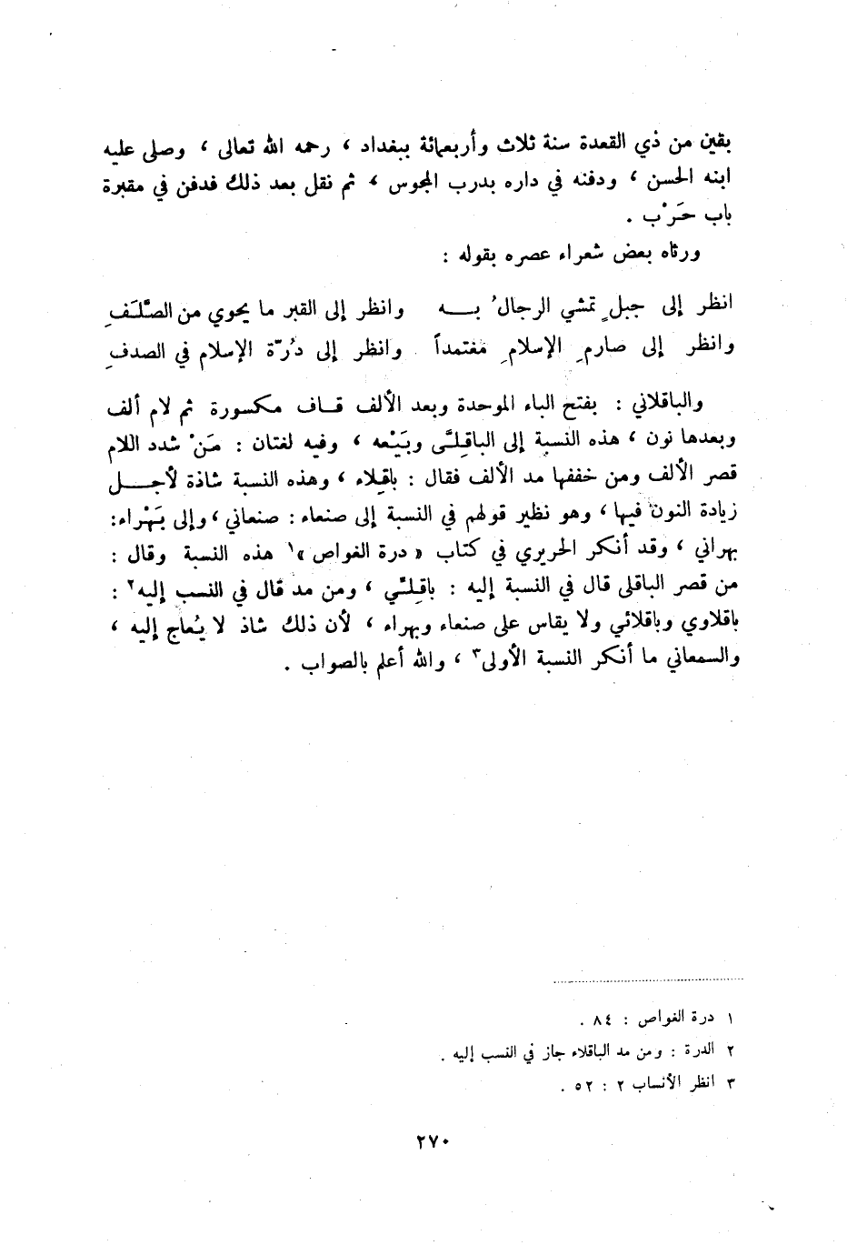 وانظر إلى صارم الإسلام مغتمدا ... وانظر إلى درة الإسلام في الصدف والباقلاني: بفتح الباء الموحدة وبعد الألف قاف مكسورة ثم لام ألف وبعدها نون، هذه النسبة إلى الباقلي وبيعه، وفيه لغتان: من شدد اللام قصر الألف ومن خفتها مد الألف فقال: باقلاء، وهذه النسبة شاذة لأجل زيادة النون فيها، وهو نظير قولهم في النسبة إلى صنعاء صنعاني، وإلى بهراء: بهرانين وقد أنكر الحريري في كتاب درة الغواص (1) هذه النسبة وقال: من قصر الباقلي قال في النسبة إليه: باقلي، ومن مد قال في النسب إليه (2) : باقلاوي وباقلائي ولايقاس على صنعاء وبهراء، لأن ذلك شاذ لايعاج إليه، والسمعاني ما أنكر النسبة الأولى (3) ، والله أعلم بالصواب.