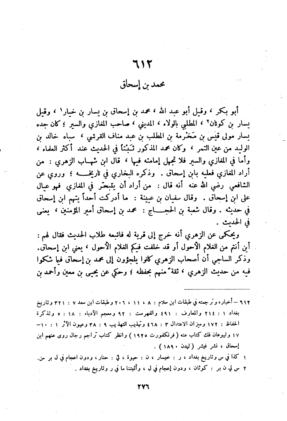 (1) أخباره وترجمته في طبقات ابن سلام: 8، 11، 206 وطبقات ابن سعد 7: 321 وتاريخ بغداد 1: 214 والمعارف: 491 والفرست: 92 ومعجم الأدباء: 18: 5 وتذكرة الحفاظ: 172 وميزان الاعتدال 3: 468 وتهذيب التهذيب 9: 38 وعيون الأثر 1: 10 - 17 وليوهان فك كتاب عنه (فرنكفورت 1925) وانظر كتاب تراجم رجال روى عنهم ابن إسحاق، نشر فيشر (ليدن 1890) .