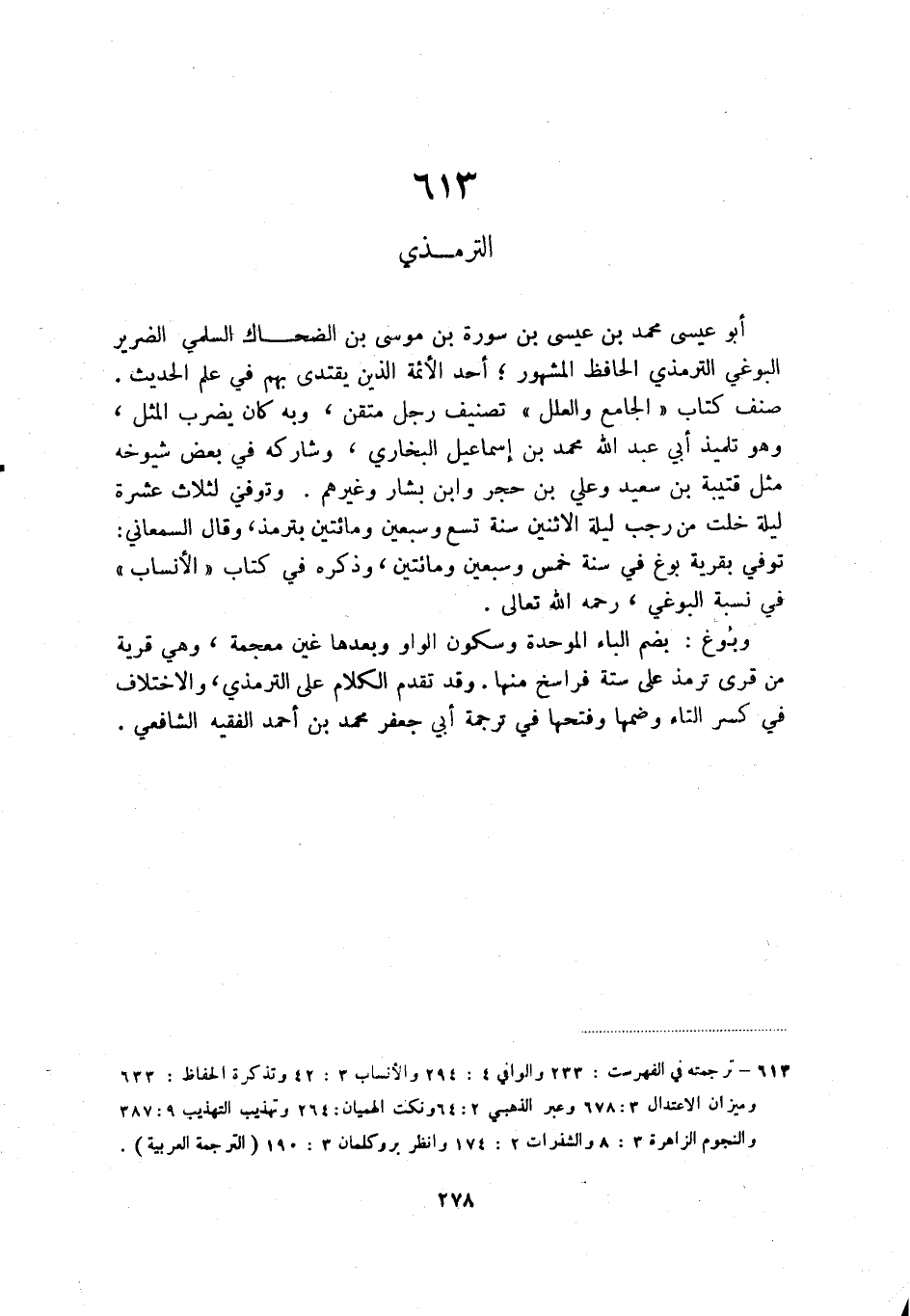 صنف كتاب الجامع والعلل تصنيف رجل متقن، وبه كان يضرب المثل، وهو تلميذ أبي عبد الله محمد بن إسماعيل البخاري، وشاركه في بعض شيوخه مثل قتيبة بن سعيد وعلي بن حجر وابن بشار وغيرهم. وتوفي لثلاث عشرة ليلة خلت من رجب ليلة الاثنين سنة تسع وسبعين ومائتين بترمذ، وقال السمعاني: توفي بقرية بوغ في سنة خمس وسبعين ومائتين، وذكره في كتاب الأنساب في نسبه البوغي، رحمه الله تعالى.