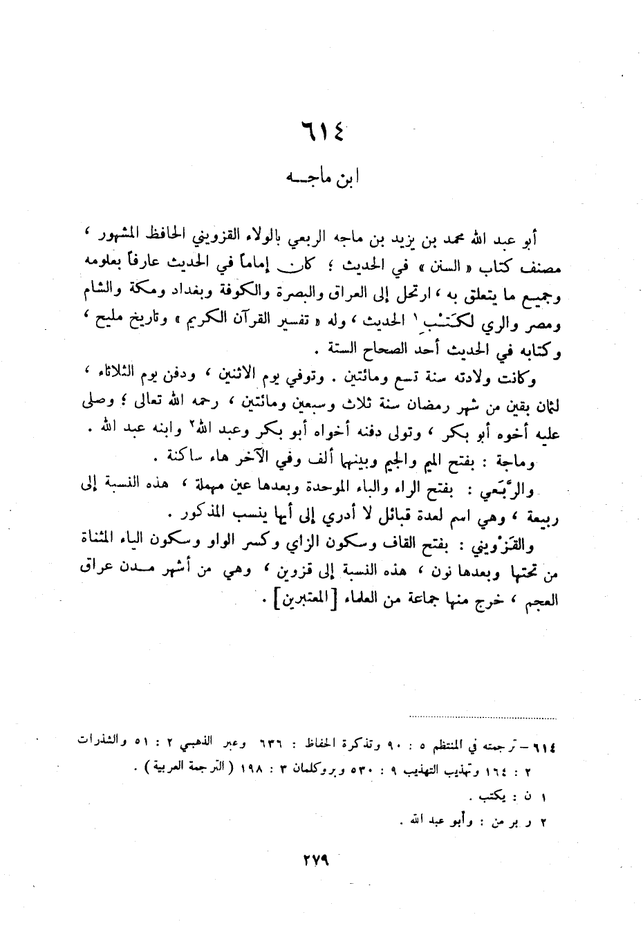 أبو عبد الله محمد بن يزيد بن ماجه الربعي بالولاء القزويني الحافظ المشهور، مصنف كتاب السنن في الحديث؛ كان إماما في الحديث عارفا بعلومه وجميع ما يتعلق به، ارتحل إلى العراق والبصرة والكوفة وبغداد ومكة والشام ومصر والري لكتب (2) الحديث، وله تفسير القرآن الكريم وتاريخ مليح، وكتابه في الحديث أحد الصحاح الستة.