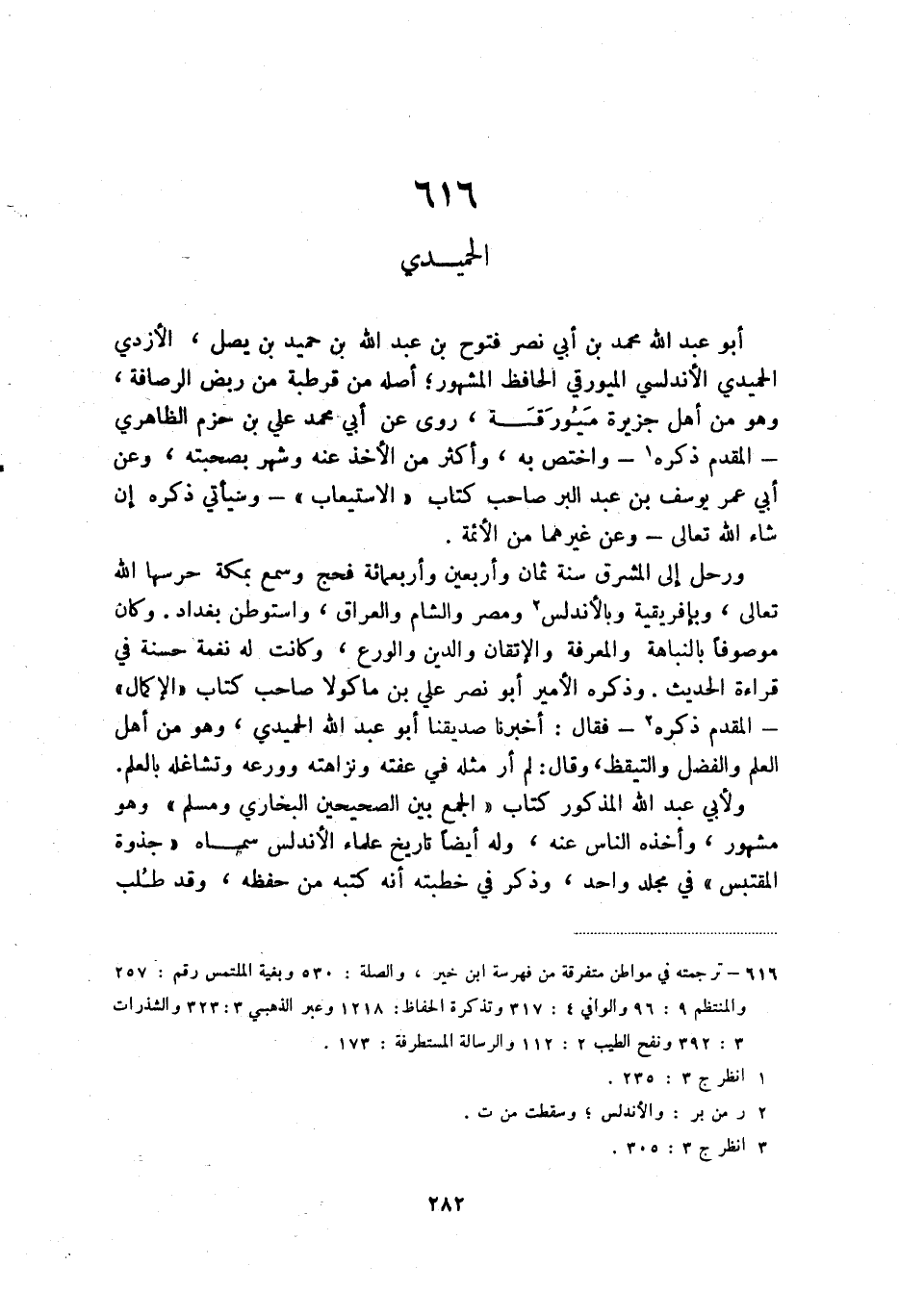 أبو عبد الله محمد بن أبي نصر فتوح بن عبد الله بن حميد بن يصل، الأزدي الحميدي الأندلسي الميورقي الحافظ المشهور؛ أصله من قرطبة من ربض الرصافة، وهو من أهل جزيرة ميورقة، روى عن أبي محمد علي بمن حزام الظاهري - المقدم ذكره (2) - واختص به، وأكثر من الأخذ عنه وشهر بصحبته، وعن أبي عمر يوسف بن عبد البر صاحب كتاب الاستيعاب - وسيأتي ذكره إن شاء الله تعالى - وعن غيرهما من الأئمة.