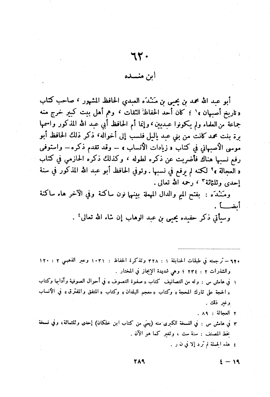 أبو عبد الله محمد بن يحيى بن منده العبدي الحافظ المشهور، صاحب كتاب " تاريخ أصبهان " (2) ؛ كان أحد الحفاظ الثقات، وهم أهل بيت كبير خرج منه جماعة من العلماء ولم يكونوا عبدين، وإنما ام الحفظ أبي عبد الله المذكور وإسمها برة بنت محمد كانت من بني عبد ياليل فنسب إلى أخواله، ذكر ذلك الحافظ أبو موسى الأصبهاني في كتاب " زيادات الأنساب " - وقد تقدم ذكره - واستوفى رفع نسبها هناك فأضربت عن ذكره لطوله، وكذلك ذكره الحازمي في كتاب " العجالة " (3) لكنه لم يرفع في نسبها. وتوفي الحافظ أبو عبد الله المذكور في سنة إحدى وثلثمائة (4) ، رحمه الله تعالى.