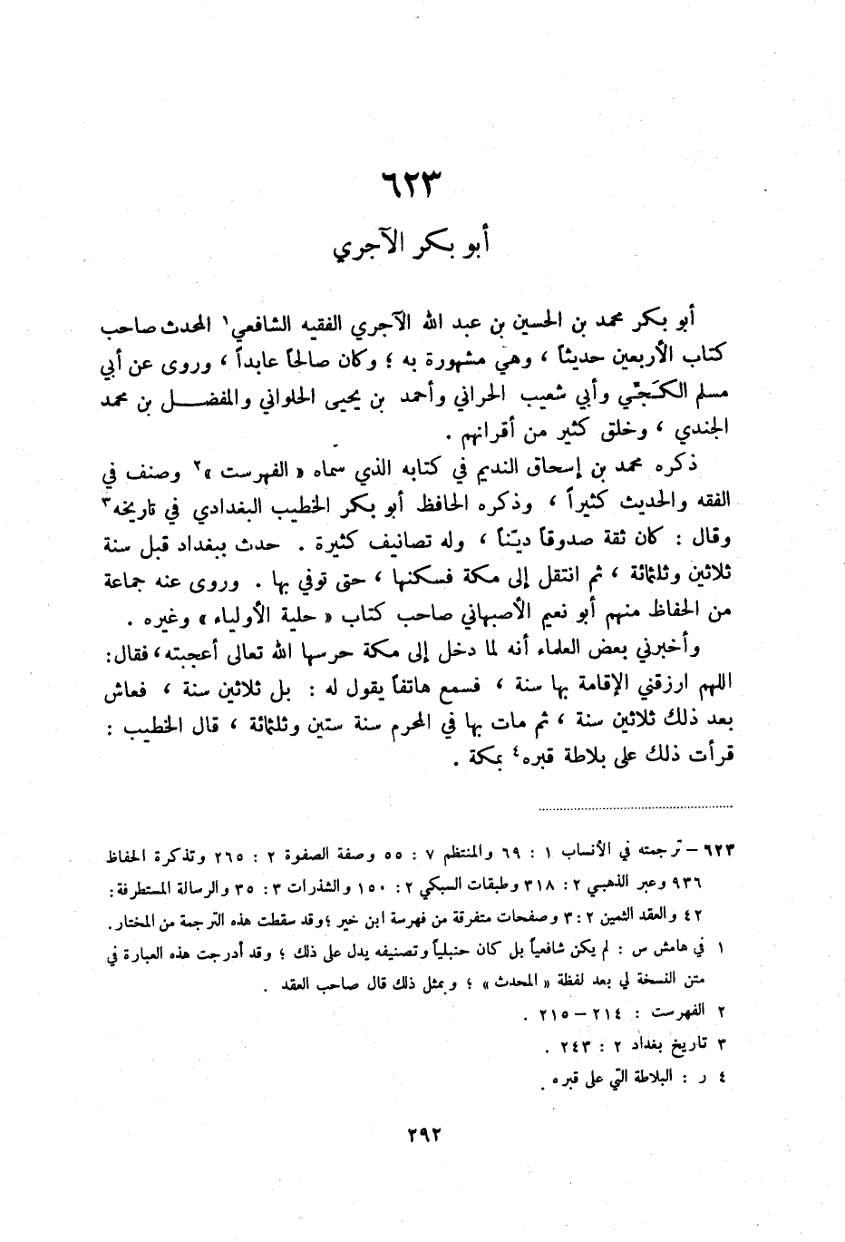 أبو بكر محمد بن الحسين بن عبد الله الآجري الفقيه الشافعي (2) المحدث صاحب كتاب الأربعين حديثا، وهي مشهورة به؛ وكان صالحا عابدا، وروى عن أبي مسلم الكجي وأبي شعيب الحراني وأحمد بن يحيى الحلواني والمفضل بن محمد الجندي، وخلق كثير من أقرانهم.