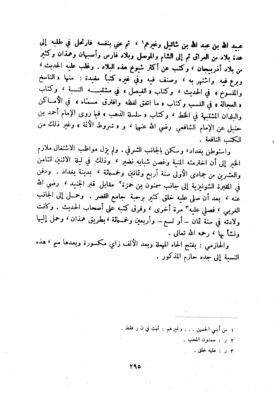 عبيد الله بن عبد الله بن شاتيل وغيرهم (1) ، ثم عني بنفسه فارتحل في طلبه إلى عدة بلاد من العراق ثم إلى الشام والموصل وبلاد فارس وأصبهان وهمذان وكثير من بلاد أذربيجان، وكتب عن أكثر شيوخ هذه البلاد، وغلب عليه الحديث، وبرع فيه واشتهر به، وصنف فيه وفي غيره كتبا مفيدة: منها " الناسخ والمنسوخ " في الحديث، وكتاب الفيصل في مشتبه النسبة، وكتاب العجالة في النسب وكتابما اتفق لفظه وافترق مسماه في الأماكن والبلدان المشتبهة في الخط، وكتابسلسلة الذهب فيما روى الإمام أحمد بن حنبل عن الإمام الشافعي رضي الله عنهما، وشروط الأئمة وغير ذلك من الكتب النافعة.
