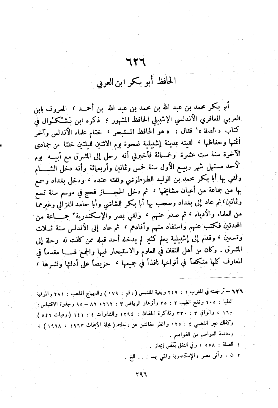 (1) ترجمته في المغرب 1: 249 وبغية الملتمس (رقم: 179) والديباج المذهب: 281 والمرقبة العليا: 105 ونفح الطيب 2: 25 وأزهار الرياض 3: 262، 86 - 95 وجذوة الاقتباس: 160 والوافي 3: 230 وتذكرة الحفاظ: 1294 والشذرات 4: 141 (وفيات 546) وكذلك عبر الذهبي 4: 125 وانظر مقالتين عن رحلته (مجلة الأبحاث 1963، 1968) ، ومقدمة العواصم من القواصم.