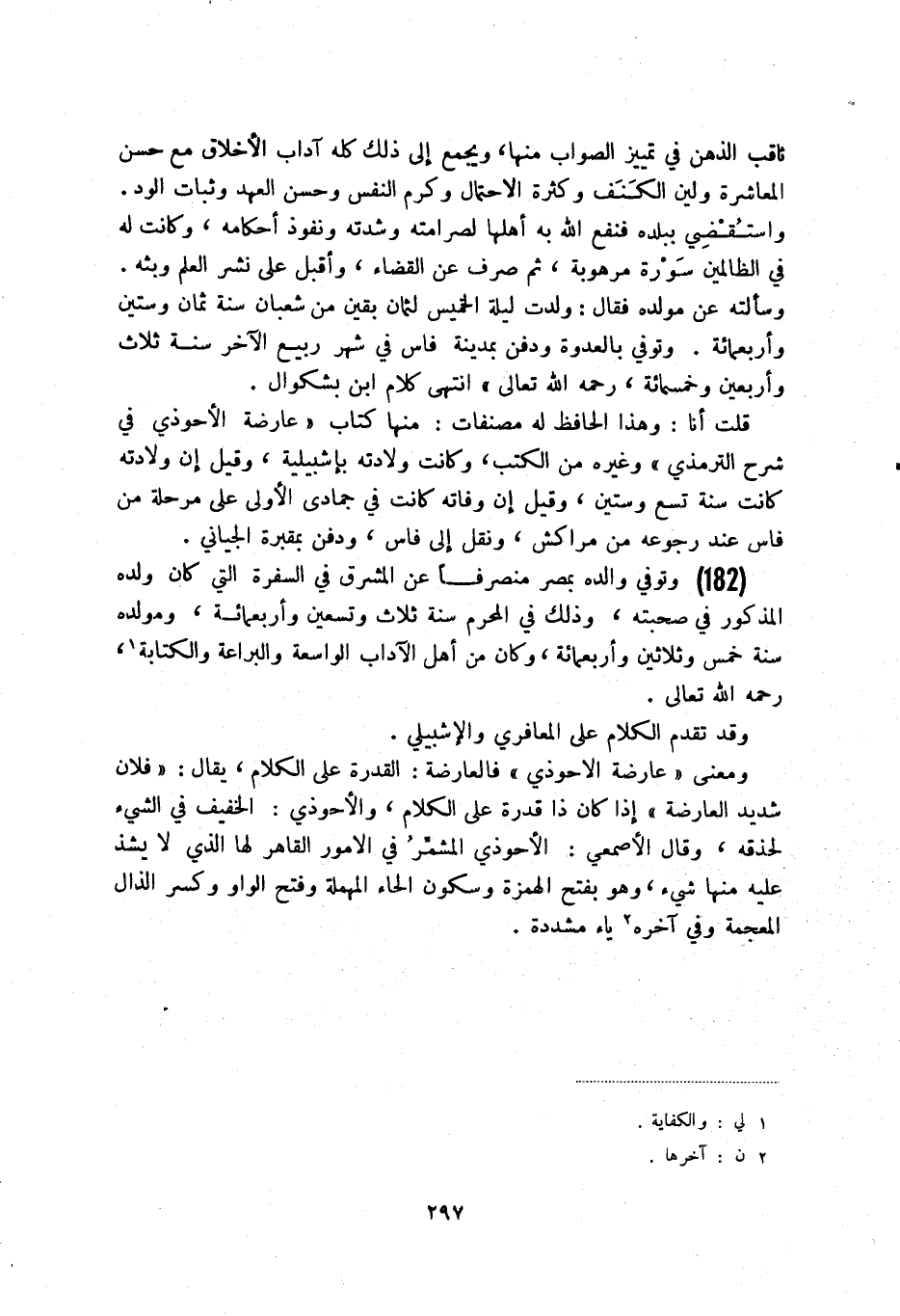 قلت أنا: وهذا الحافظ له مصنفات: منها كتابعارضة الأحوذي في شرح الترمذي وغيره من الكتب، وكانت ولادته بإشبيلية، وقيل إن ولادته كانت سنة تسع وستين، وقيل إن وفاته كانت في جمادى الأولى على مرحلة من فاس عند رجوعه من مراكش، ونقل إلى فاس، ودفن بمقبرة الجياني.