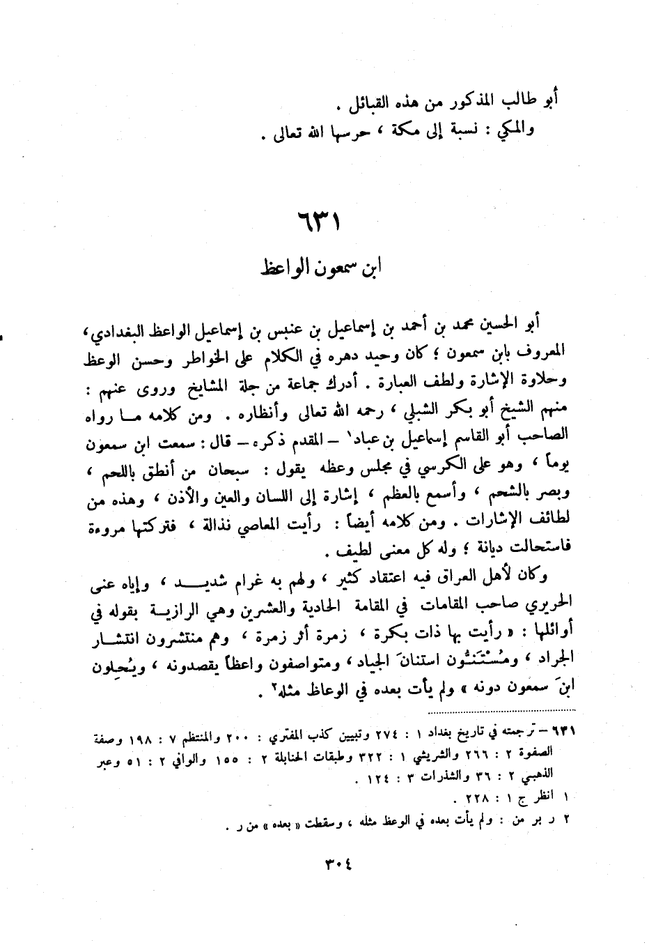 أبو الحسين محمد بن أحمد بن إسماعيل بن عنبس بن إسماعيل الواعظ البغدادي، المعروف بابن سمعون؛ كان وحيد دهره في الكلام على الخواطر وحسن الوعظ وحلاوة الإشارة ولطف العبارة. أدرك جماعة من جلة المشايخ وروى عنهم: منهم الشيخ أبو بكر الشبلي، رحمه الله تعالى وأنظاره. ومن كلامه ما رواه الصاحب أبو القاسم إسماعيل بن عباد (2) - المقدم ذكره - قال: سمعت ابن سمعون يوما، وهو على الكرسي في مجلس وعظه يقول: سبحان من أنطق باللحم، وبصر بالشحم، وأسمع بالعظم، إشارة إلى اللسان والعين والأذن، وهذه من لطائف الإشارات. ومن كلامه أيضا: رأيت المعاصي نذالة، فتركتهامروءة فاستحال ديانة؛ وله كل معنى لطيف.