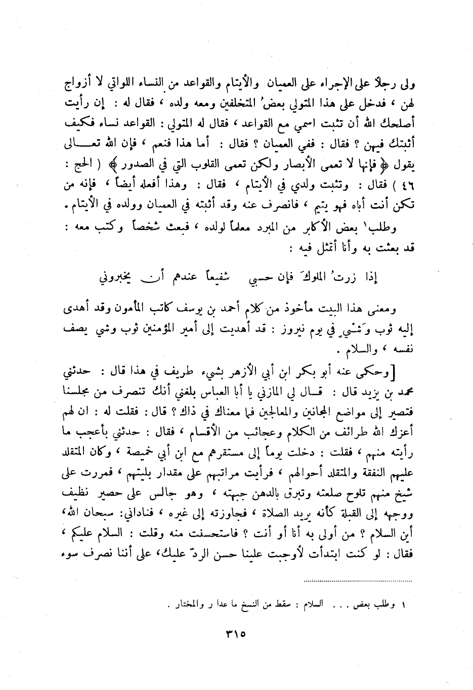 [وحكى عنه أبو بكر ابن أبي الأزهر بشيء طريف في هذا قال: حدثني محمد بن يزيد قال: قال لي المازني ياأبا العباس بلغني أنك تنصرف من مجلسنا فتصير إلى مواضع المجانين والمعالجين فما معناك في ذاك قال: فقلت له: ان لهم أعزك الله طرائف من الكلام وعجائب من الأقسام، فقال: حدثني بأعجب ما رأيته منهم، فقلت: دخلت يوما إلى مستقرهم مع ابن أبي خميصة، وكان المتقلد عليهم النفقة والمتقلد أحوالهم، فرأيت مراتبهم على مقدار بليتهم، فمررت على شيخ منهم تلوح صلعته وتبرق بالدهن جبهته، وهو جالس على حصير نظيف ووجهه إلى القبلة كأنه يريد الصلاة، فجاوزته إلى غيره، فناداني: سبحان الله، اين السلام من أولى به أنا أو أنت فاستحسنت منه وقلت: السلام عليكم، فقال: لو كنت ابتدأت لأوجبت علينا حسن الرد عليك، على أننا نصرف سوء