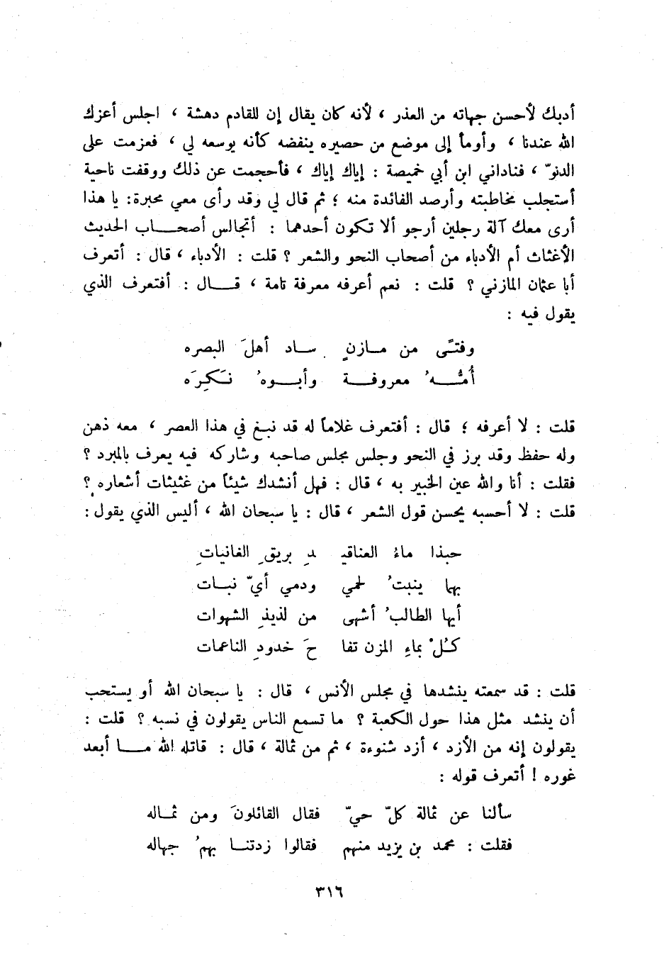 أمه معروفة ... وأبوه نكره قلت لاأعرفه؛ قال: أفتعرف غلاما له قد نبغ في هذا العصر، معه ذهن وله حفظ وقد برز في النحو وجلس مجلس صاحبه وشاركه فيه يعرف بالمبرد فقلت: أنا والله عين الخبير به، قال: فهل أنشدك شيئا من غثيثات أشعاره قلت: لاأحسبه يحسن قول الشعر، قال: ياسبحان الله، أليس الذي يقول:
