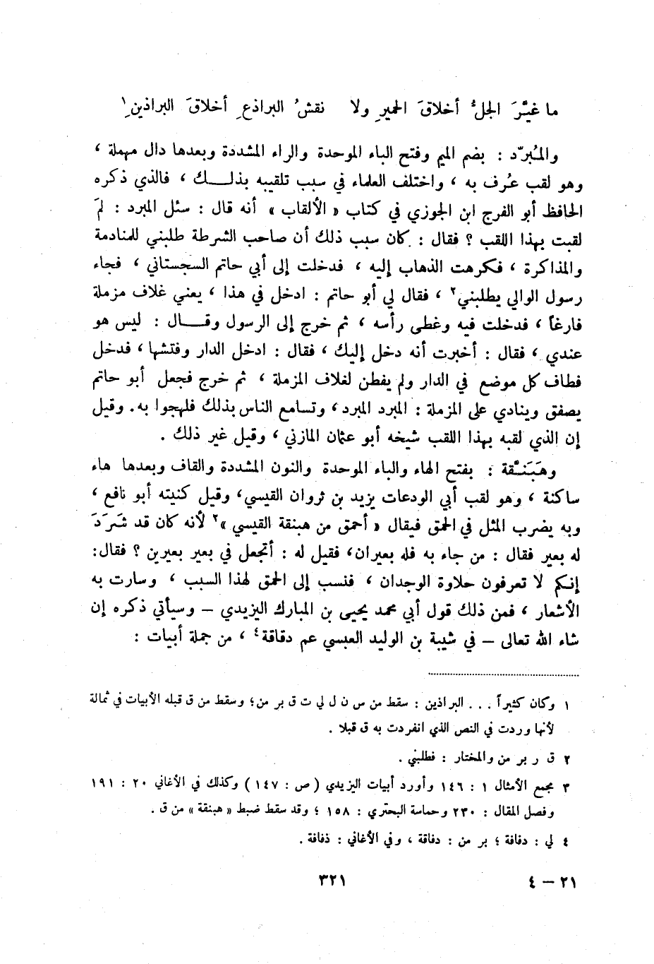 ما غير الجل أخلاق الحمير ولا ... نقش البراذع أخلاق البراذين (1) والمبرد: بضم الميم وفتح الباء الموحدة والراء المشددة وبعدها دال مهملة، وهو لقب عرف به، واختلف العلماء في سبب تلقيبه بذلك، فالذي ذكره الحافظ أبو الفرج ابن الجوزي في كتاب الألقاب أنه قال: سئل المبرد: لم لقبت بهذا اللقب فقال: كان سبب ذلك أن صاحب الشرطة طلبني للمنادمة والمذاكرة، فكرهت الذهاب إليه، فدخلت إلى أبي حاتم السجستاني، فجاء رسول الوالي يطلبني (2) ، فقال لي أبو حاتم: ادخل في هذا، يعني غلاف مزملة فارغا، فدخلت فيه وغطى رأسه، ثم خرج إلى الرسول وقال: ليس هو عندي، فقال: أخبرت أنه دخل إليك، فقال: إدخل الدار وفتشها، فدخل فطاف كل موضع في الدار ولم يفطن لغلاف المزملة، ثم خرج فجعل أبو حاتم يصفق وينادي على المزملة: المبرد المبرد، وتسامع الناس بذلك فلهجوا به. وقيل إن الذي لقبه بهذا اللقب شيخه أبو عثمان المازني، وقيل غير ذلك.