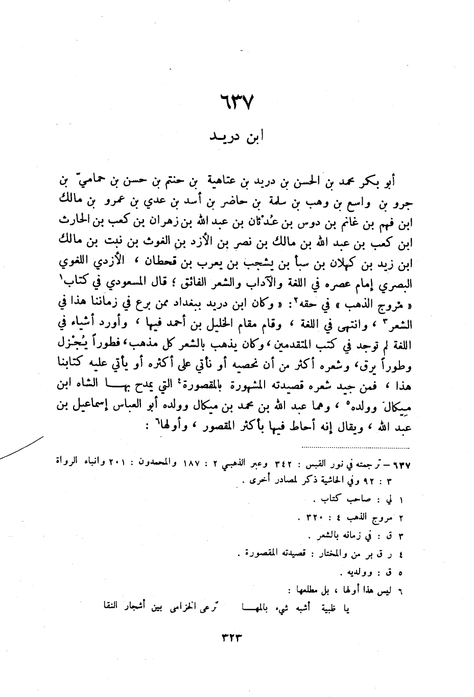 أبو بكر محمد بن الحسن بن دريد بن عتاهية بن حنتم بن حسن بن حمامي بن جرو بن واسع بن وهب بن سلمة ابن حاضر بن أسد بن عدي بن عمرو بن مالك بن فهم بن غانم بن دوس بن عدنان بن عبد الله بن زهران بن كعب بن الحارث بن كعب بن عبد الله بن مالك بن نصر بن الأزد بن الغوث بن نبت بن مالك بن زيد بن كهلان بن سبأ بن يشجب بن يعرب بن قحطان، الأزدي اللغوي البصري إمام عصره في اللغة والآداب والشعر الفائق؛ قال المسعودي في كتاب (2) " مروج الذهب " في حقه (3) : وكان ابن دريد ببغداد ممن برع في زماننا هذا في الشعر (4) ، وانتهى في اللغة، وقام مقام الخليل بن أحمد فيها، وأورد أشياء في اللغة لم توجد في كتب المتقدمين، وكان يذهب بالشعر كل مذهب، فطورا يجزل وطورا يرق، وشعره أكثر من أن نحصيه أو نأتي على أكثره أو يأتي عليه كتابنا هذا، فمن جيد شعره قصيدته المشهورة بالمقصورة (5) التي يمدح بها الشاه ابن ميكال وولده (6) ، وهما عبد الله بن محمد بن ميكال وولده أبو العباس إسماعيل بن عبد الله، ويقال إنه أحاط فيها بأكثر المقصور، وأولها (7) :