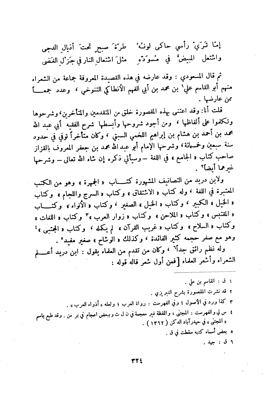 قلت أنا: وقد اعتنى بهذه المقصورة خلق من المتقدمين والمتأخرين، وشرحوها وتكلموا على ألفاظها، ومن أجود شروحها وأبسطها شرح الفقيه أبي عبد الله محمد بن أحمد بن هشام ابن إبراهيم اللخمي السبتي، وكان متأخرا توفي في حدود سنة سبعين وخمسمائة، وشرحها الإمام أبو عبد الله محمد ابن جعفر المعروف بالقزاز صاحب كتاب الجامع في اللغة - وسيأتي ذكره إن شاء الله تعالى - وشرحها غيرهما أيضا (2) .