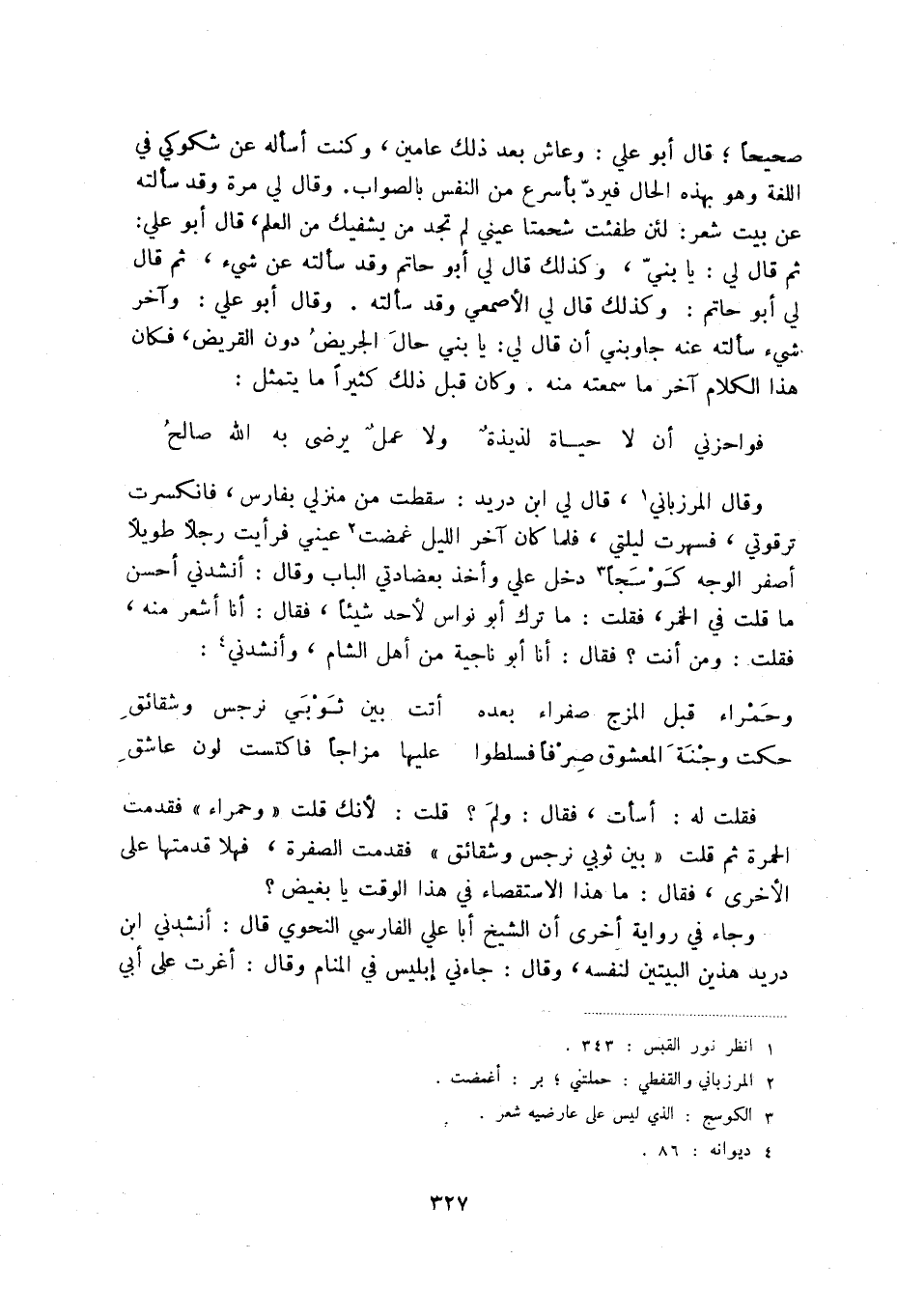 صحيحا؛ قال أبو علي: وعاش بعد ذلك عامين، وكنت أسأله عن شكوكي في اللغة وهو بهذه الحال فيرد بأسرع من النفس بالصواب. وقال لي مرة وقد سألته عن بيت شعر: لئن طفئت شحمتا عيني لم تجد من يشفيك من العلم، قال أبو علي: ثم قال لي: يابني، وكذلك قال لي أبو حاتم وقد سألته عن شيء، ثم قال لي أبو حاتم: وكذلك قال لي الأصمعي وقد سألته. وقال أبو علي: وآخر شيء سألته عنه جاوبني أن قال لي: يابني حال الجريض دون القريض، فكان هذا الكلام آخر ماسمعته منه وكان قبل ذلك كثيرا ما يتمثل: