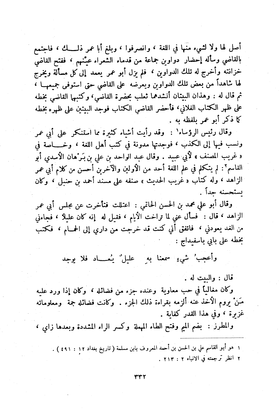 أصل لها ولا لشيء منها في اللغة، وانصرفوا، وبلغ أبا عمر ذلك، فاجتمع بالقاضي وسأله إحضار دواوين جماعة من قدماء الشعراء عينهم، ففتح القاضي خزانته وأخرج له تلك الدواوين، فلم يزل أبو عمر يعمد إلى كل مسألة ويخرج لها شاهدا من بعض تلك الدواوين ويعرضه على القاضي حتى استوفى جميعها، ثم قال له: وهذان البيتان أنشدهما ثعلب بحضرة القاضي، وكتبهما القاضي بخطه على ظهر الكتاب الفلاني، فأحضر القاضي الكتاب فوجد البيتين على ظهره بخطه كما ذكر أبو عمر بلفظه به.