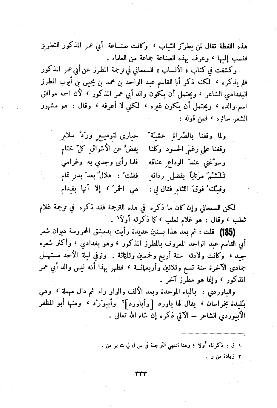 (185) قلت: ثم بعد هذا بسنين عديدة رأيت بدمشق المحروسة ديوان شعر أبي القاسم عبد الواحد المعروف بالمطرز المذكور، وهو بغدادي، وأكثر شعره جيد، وكانت ولادته سنة أربع وخمسين وثلثمائة. وتوفي ليلة الأحد مستهل جمادى الآخرة سنة تسع وثلاثين وأربعمائة، فظهر بهذا أنه ليس والد أبي عمرالمذكور، وإنما هو مطرز آخر.