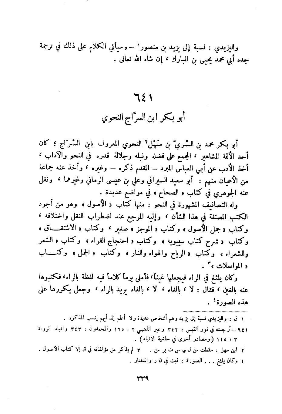 أبو بكر محمد بن السري بن سهل (3) النحوي المعروف بابن السراج؛ كان أحد الأئمة المشاهير، المجمع على فضله ونبله وجلالة قدره في النحو والآداب، أخذ الأدب عن أبي العباس المبرد - المقدم ذكره - وغيره، وأخذ عنه جماعة من الأعيان منهم: أبو سعيد السيرافي وعلي بن عيسى الرماني وغيرهما، ونقل عنه الجوهري في كتاب الصحاح في مواضع عديدة. وله التصانيف المشهورة في النحو: منها كتاب الأصول وهو من أجود الكتب المصنفة في هذا الشأن، وإليه المرجع عند اضطراب النقل واختلافه، وكتابجمل الأصول وكتاب الموجز صغير، وكتاب الاشتقاق وكتابشرح كتاب سيبويه وكتاب احتجاج القراء وكتاب الشعر والشعراء وكتاب الرياح والهواء والنار وكتاب الجمل وكتاب " المواصلات " (4) .