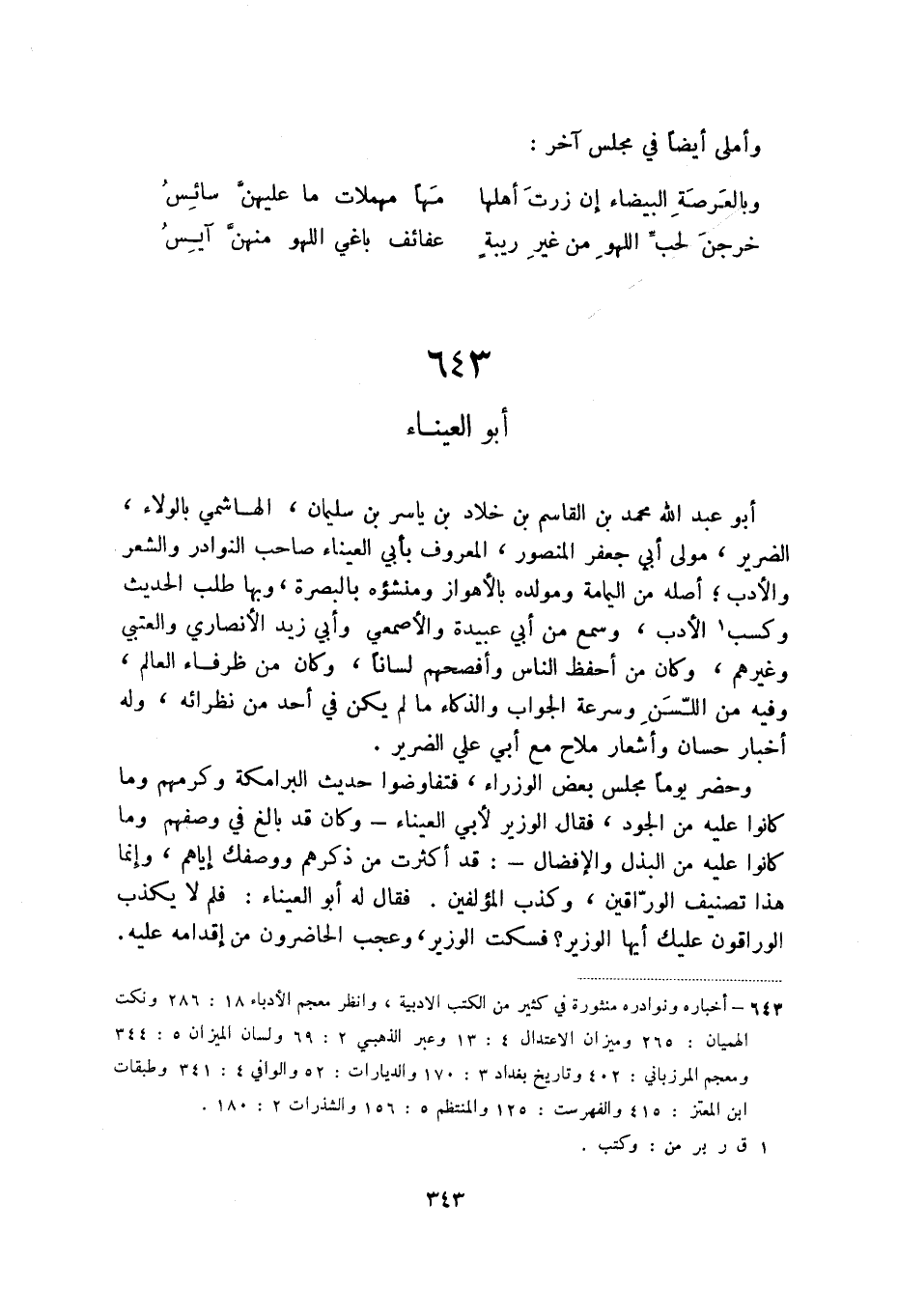 (1) أخباره ونوادره منشورة في كثير من الكتب الأدبية، وانظر معجم الأدباء 18: 286 ونكت الهميان: 265 وميزان الاعتدال 4: 13 وعبر الذهبي 2: 69 ولسان الميزان 5: 344 ومعجم المرزباني: 402 وتاريخ بغداد 3: 170 والديارات: 52 والوافي 4: 341 وطبقات ابن المعتز: 415 والفهرست: 125 والمنتظم 5: 156 والشذرات 2: 180.