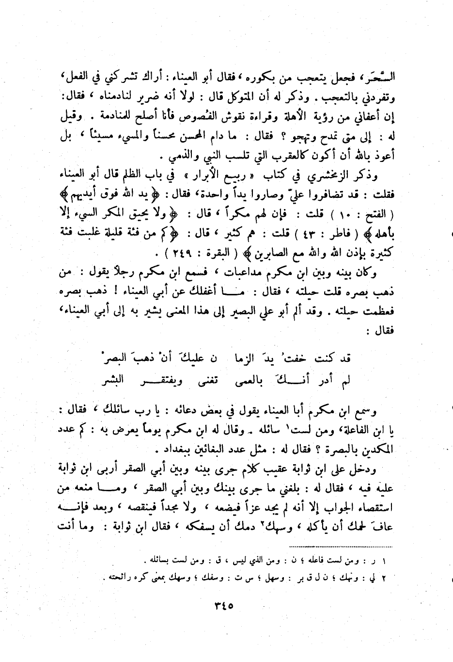 لم أدر أنك بالعمى ... تغنى ويفتقر البشر وسمع ابن مكرم أبا العيناء يقول في بعض دعائه: يارب سائلك، فقال يا ابن الفاعلة، ومن لست (1) سائله. وقال له ابن مكرم يوما يعرض به: كم عدد المكدين بالبصرة فقال له: مثل عدد البغائين ببغداد.