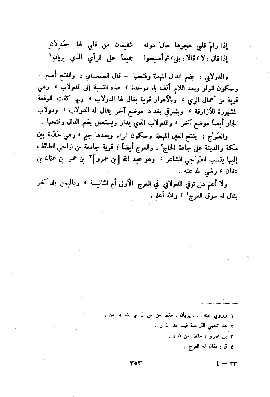إذا قال: لا، قالا: بلى، ثم أصبحوا ... جميعا على الرأي الذي يريان (1) والدولابي: بضم الدال المهملة وفتحها - قال السمعاني: والفتح أصح - وسكون الواو وبعد اللام الف باء موحدة، هذه النسبة إلى الدولاب، وهي قرية من أعمال الري، وبالأهواز قرية يقال لها الدولاب، وبها كانت الوقعة المشهورة للأزارقة، وبشرقي بغداد موضع آخر يقال له الدولاب، ودولاب الجار أيضا موضع آخر، والدولاب الذي يدار ويستعمل بضم الدال وفتحها.
