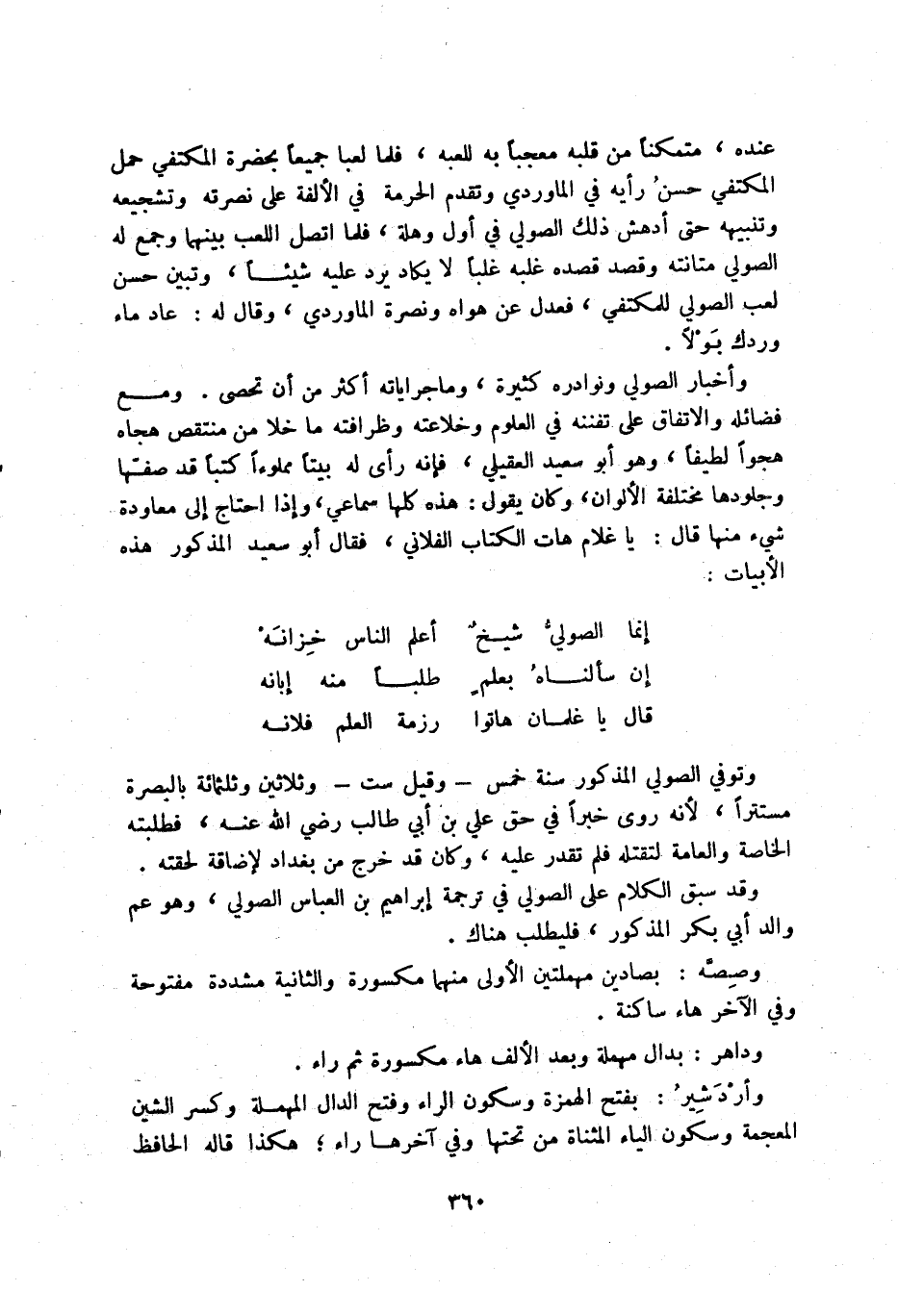 قال يا غلمان هاتوا ... رزمة العلم فلانه وتوفي الصولي المذكور سنة خمس - وقيل ست - وثلاثين وثلثمائة بالبصرة مستترا، لأنه روى خبرا في حق علي بن أبي طالب رضي الله عنه، فطلبته الخاصة والعامة لتقتله فلم تقدر عليه، وكان قد أخرج من بغداد لإضاقه لحقته.