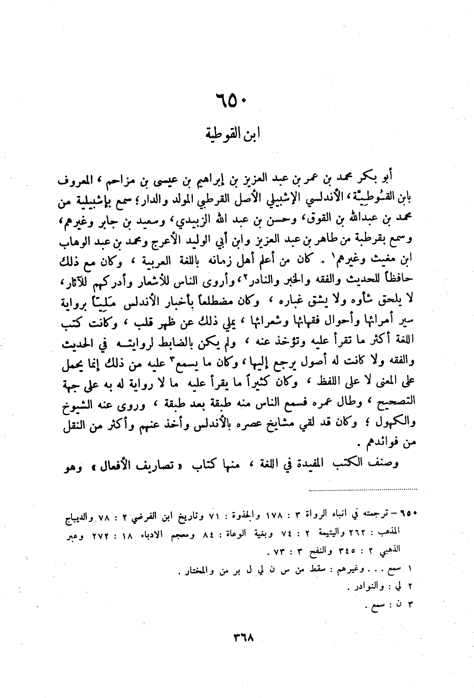 أبو بكر محمد بن عمر بن عبد العزيز بن إبراهيم بن عيسى بن مزاحم، المعروف بابن القوطية، الأندلسي الإشبيلي الأصل القرطبي المولد والدار؛ سمع بإشبيلية من محمد بن عبد الله ابن القوق، وحسن بن عبد الله الزبيدي، وسعيد بن جابر وغيرهم، وسمع بقرطبة من طاهر بن عبد العزيز وابن أبي الوليد الأعرج ومحمد بن عبد الوهاب ابن مغيث وغيرهم (2) . كان من أعلم أهل زمانه باللغة العربية، وكان مع ذلك حافظا للحديث والفقه والخبر والنادر (3) ، وأروى الناس للأشعار وأدركهم للآثار، لايلحق شأوه ولا يشق غباره، وكان مضطلعا بأخبار الأندلس مليا برواية سير أمرائها وأحوال فقائها وشعرائها، يملي ذلك عن ظهر قلب، وكانت كتب اللغة أكثر ما تقرأ عليه وتؤخذ عنه، ولم يكن بالضابط لروايته في الحديث والفقه ولا كانت له أصول يرجع إليها، وكان ما يسمع (4) عليه من ذلك إنما يحمل على المعنى لا على اللفظ، وكان كثيرا ما يقرأ عليه مالا رواية به على جهة التصحيح، وطال عمره فسمع الناس منه طبقة بعد طبقة، وروى عنه الشيوخ والكهول؛ وكان قد لقي مشايخ عصره بالأندلس وأخذ عنهم وأكثر من النقل من فوائدهم.