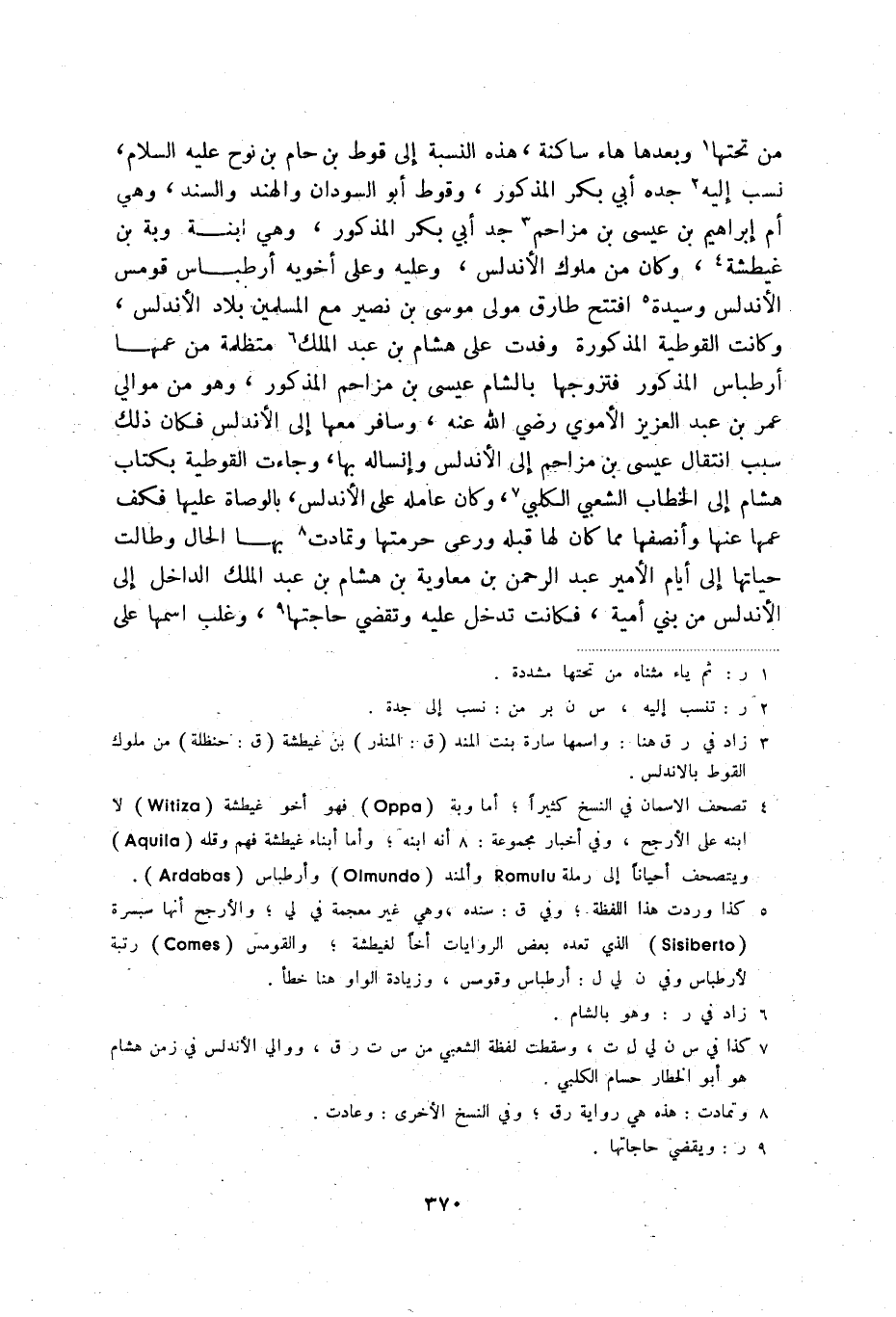 (4) تصحف الأسمان في النسخ كثيراً؛ أما وبة (Oppa) فهو أخو غيطشة (Witiza) لا ابنه على الأرجح، وفي أخبار مجموعة: 8 أنه ابنه؛ وأما أبناء غيطشة فهم وقله (Aquila) ويتصحف أحياناً إلى رملة Romulu وألمند (Olmundo) وأرطباس (Ardadas) .