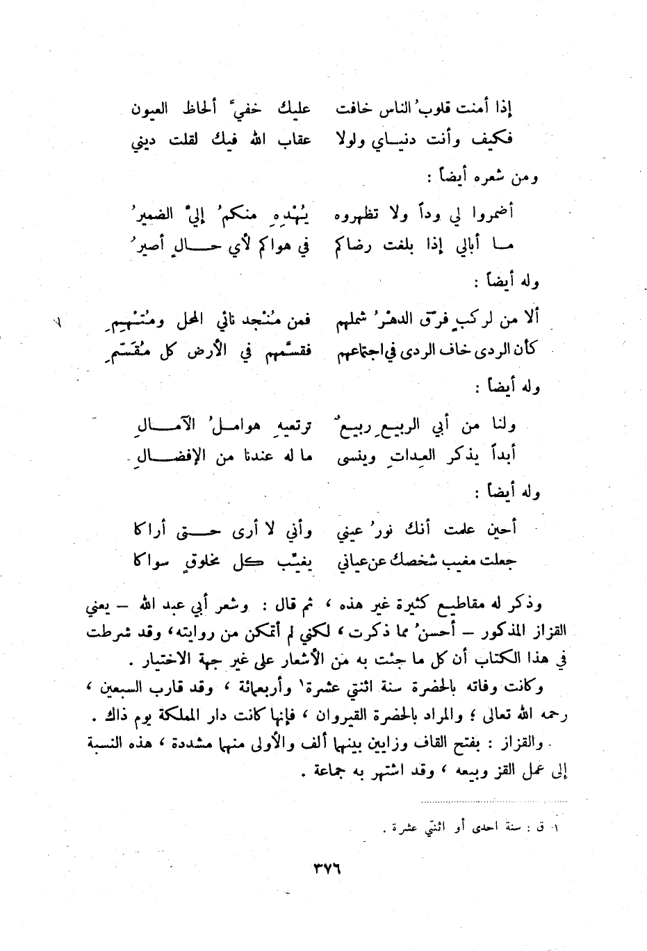جعلت كغيب شخصك عن عياني ... يغيب كل مخلوق سواكا وذكر له مقاطيع مثيرة غير هذه، ثم قال: وشعر أبي عبد الله - يعني القزاز المذكور - أحسن مما ذكرت، لكني لم أتمكن من روايته، وقد شرطت في هذا الكتاب أن كل ماجئت به من الأشعار على غير جهة الاختيار.