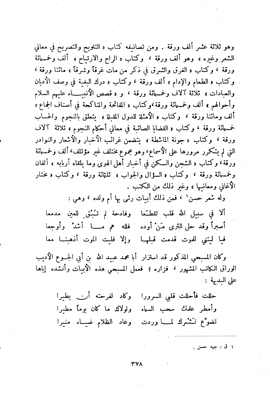 وهو ثلاثة عشر ألف ورقة. ومن تصانيفه كتاب التلويح والتصريح في معاني الشعر وغيره وهو ألف ورقة، وهو ألف ورقة، وكتاب الراح والارتياح ألف وخمسمائة ورقة، وكتاب الغرق والشرق في ذكر من مات غرقا غرقا وشرقا مائتا ورقة، وكتاب الطعام والإدام ألف ورقة، وكتاب درك البغية في وصف الأديان والعبادات ثلاثة آلاف وخمسمائة ورقة، وقصص الأنبياء عليهم السلام وأحوالهم ألف وخمسمائة ورقة، وكتاب المفاتحة والمناكحة في أصناف الجماع ألف ومائتا ورقة، وكتاب الأمثلة للدول المقبلة يتعلق بالنجوم والحساب خمسمائة ورقة، وكتاب القضايا الصائبة في معاني أحكام النجوم ثلاثة آلاف ورقة، وكتاب جونة الماشطة يتضمن غرائب الأخبار والأشعار والنوادر التي لم يتكرر مرورها على الأسماع، وهو مجموع مختلف غير مؤتلف، ألف وخمسمائة ورقة، وكتاب الشجن والسكن في أخبار أهل الهوى وما يلقاه أربابه ألفان وخمسمائة ورقة، وكتاب السؤال والجواب ثلثمائة ورقة، وكتاب السؤال والجواب ثلثمائة ورقة، وكتاب مختار الأغاني ومعانيها وغير ذلك من الكتب.