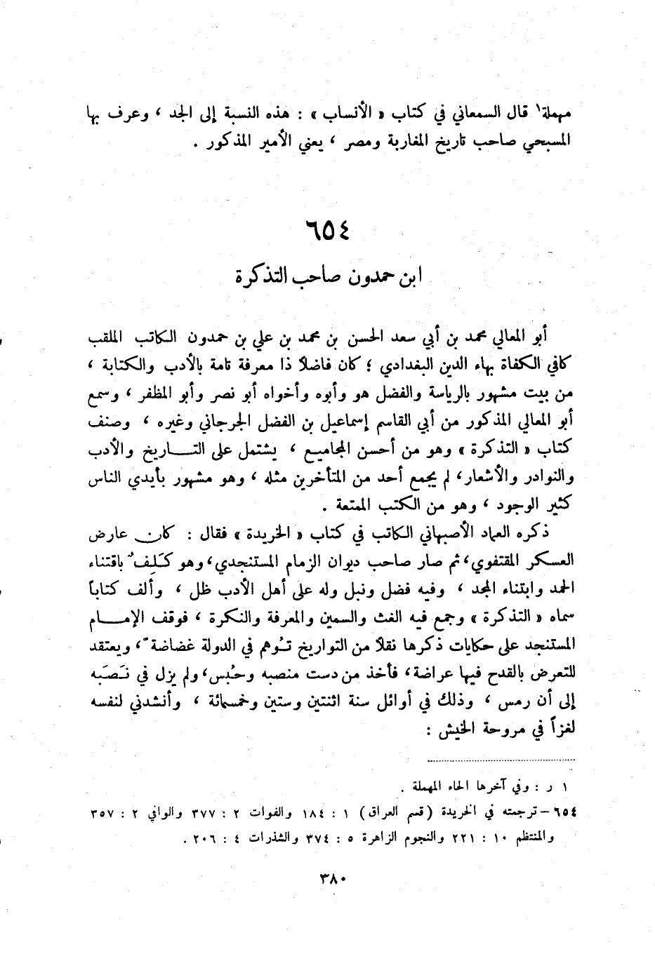 أبو المعالي محمد بن أبي سعد الحسن بن محمد بن علي بن حمدون الكاتب الملقب كافي الكفاة بهاء الدين البغدادي؛ كان فاضلا ذا معرفة تامة بالأدب والكتابة، من بيت مشهور بالرياسة والفضل هو وأبوه وأخواه أبو نصر وأبو المظفر، وسمع أبو المعالي المذكور من أبي القاسم إسماعيل بن الفضل الجرجاني وغيره، وصنف كتاب التذكرة وهو من أحسن المجاميع، يشتمل على التاريخ والأدب والنوادر والأشعار، لم يجمع أحد من المتأخرين مثله، وهو مشهور بأيدي الناس كثير الوجود، وهو من الكتب الممتعة.
