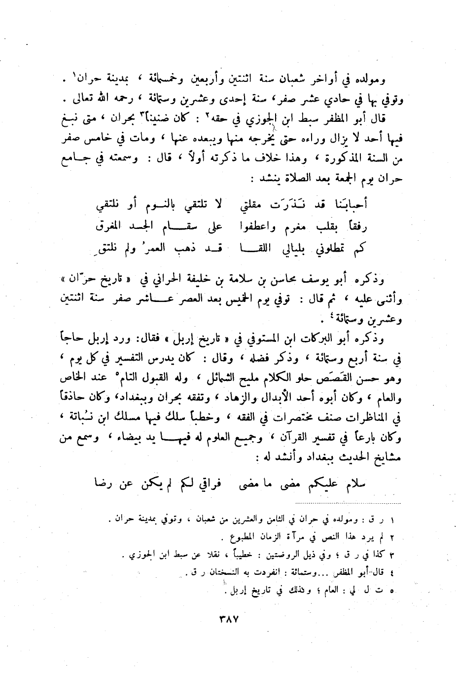 قال أبو المظفر سبط ابن الجوزي في حقه (2) : كان ضنينا (3) بحران، متى نبغ فيها أحد لايزال وراءه حتى يخرجه منها ويبعده عنها، ومات في خامس صفر من السنة المذكورة، وهذا خلاف ما ذكرته أولا، قال: وسمعته في جامع حران يوم الجمعة بعد الصلاة ينشد: