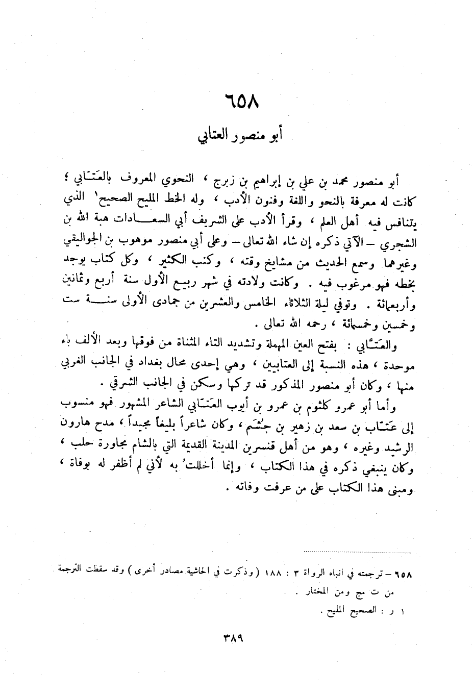 وأما أبو عمرو كلثوم بن عمرو بن أيوب العتابي الشاعر المشهور فهو منسوب إلى عتاب بن سعد بن زهير بن جشم، وكان شاعرا بليغا مجيدا، مدح هارون الرشيد وغيره، وهو من اهل قنسرين المدينة القديمة التي بالشام مجاورة حلب، وكان ينبغي ذكره في هذا الكتاب، وإنما أخللت به لأني لم أظفر له بوفاة، ومبنى هذا الكتاب على من عرفت وفاته.