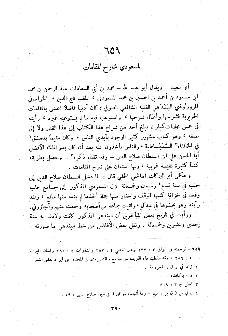 أبو سعيد - ويقال أبو عبد الله - محمد بن أبي السعادات عبد الرحمن بن محمد بن مسعود بن أحمد بن الحسين بن محمد المسعودي، الملقب تاج الدين، الخراساني المروروذي البندهي الفقيه الشافعي الصوفي؛ ان أديبا فاضلا اعتنى بالمقامات الحريرية فشرحها وأطال شرحها، واستوعب فيه مالم يستوعبه غيره، رأيته في خمس مجلدات كبار لم يبلغ أحد من شراح هذا الكتاب إلى هذا القدر ولا إلى نصفه، وهو مشهور كثير الوجود بأيدي الناس، وكان مقيما بدمشق (2) في الخانقاه (3) السميساطية، والناس يأخذون عنه بعد أن كان يعلم الملك الأفضل أبا الحسن علي ابن السلطان صلاح الدين - وقد تقدم ذكره (4) - وحصل بطريقه كتبا كثيرة نفيسة غريبة، وبها استعان على شرح المقامات.