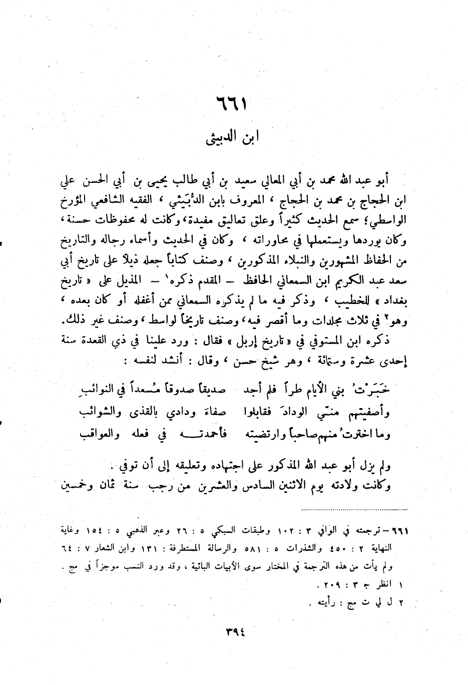 (1) ترجمته في الوافي 3: 102 وطبقات السبكي 5: 26 وعبر الذهبي 5: 154 وغاية النهاية 2: 450 والشذرات 5: 581 والرسالة المستطرفة: 131 وابن الشعار 7: 64 ولم يأت من هذه الترجمة في المختار سوى الأبيات البائية، وقد ورد النسب موجزاً في مج.