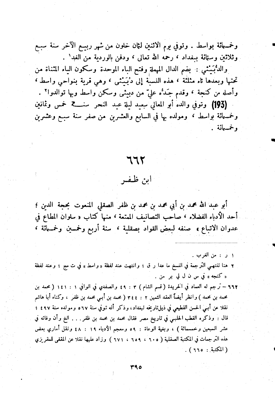 (3) ترجم له العماد في الخريدة (قسم الشام) 3: 49 والصفدي في الوافي 1: 141 (محمد بن محمد بن محمد) وانظر أيضاً العقد الثمين 2: 344 (محمد بن أبي محمد بن مظفر، وكناه أبا هاشم نقلاً عن أبي الحسن القطيعي في ذيل تاريخه لبغداد، وذكر أنه توفي سنة 567 ومولده سنة 497؛ قال: وذكره القطب الحلبي في تاريخ مصر فقال محمد بن محمد بن ظفر ... الخ وأن وفاته في عشر السبعين وخمسمائة) ، وبغية الوعاة: 59 ومعجم الأدباء 19: 48 ونقا أماري بعض هذه الترجمات في المكبتة الصقلية (605، 659، 671) وزاد عليها نقلاً عن المقفى للمقريزي (المكتبة: 665) .