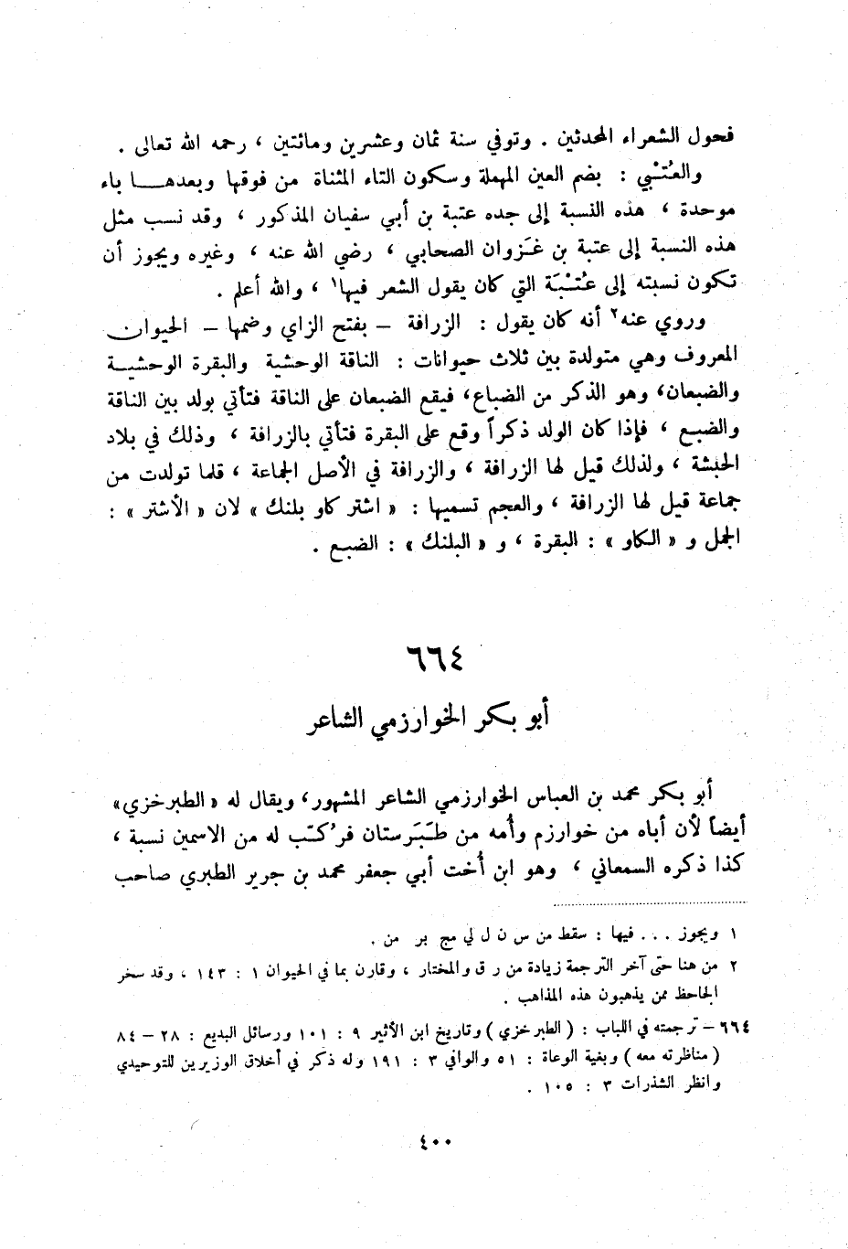 (3) ترجمته في اللباب: (الطبرخزي) وتاريخ ابن الأثير 9: 101 ورسائل البديع: 28 - 84 (مناظرته معه) وبغية الوعاة: 51 والوافي 3: 191 وله ذكر في أخلاق الوزيرين للتوحيدي وانظر الشذرات 3: 105.