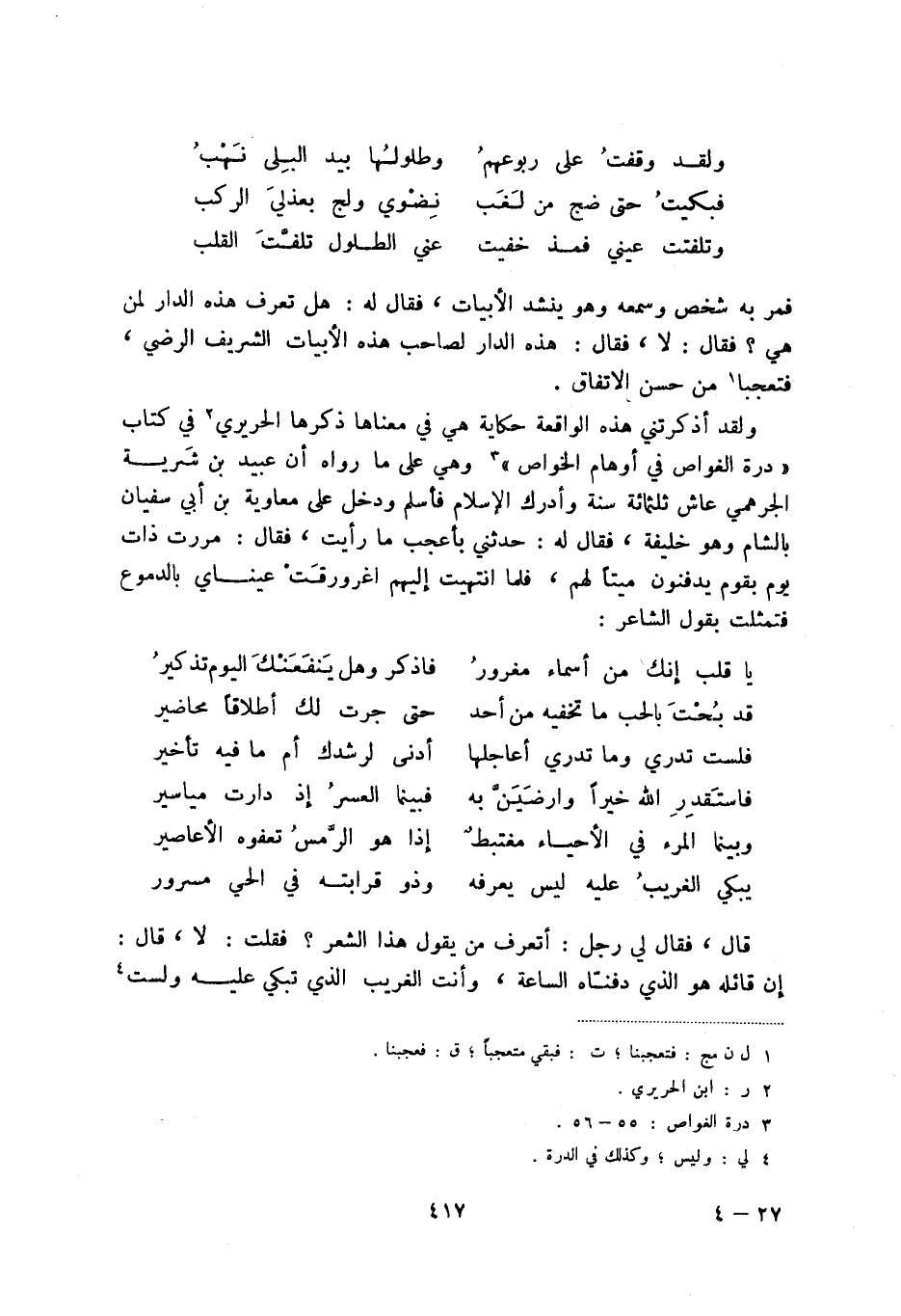 ولقد اذكرتني هذه الواقعة حكاية هي في معناها ذكرها الحريري (2) في كتاب " درة الغواص في أوهام الخواص " (3) وهي على ما رواه أن عبيد بن شرية الجرهمي عاش ثلثمائة سنة وأدرك الإسلام ودخل على معاوية بن أبي سفيان بالشام وهو خليفة، فقال له: حدثني بأعجب ما رأيت، فقال: مررت ذات يوم بقوم يدفنون ميتا لهم، فلما انتهيت إليهم اغرورقت عيناي بالدموع فتمثلت بقول الشاعر: