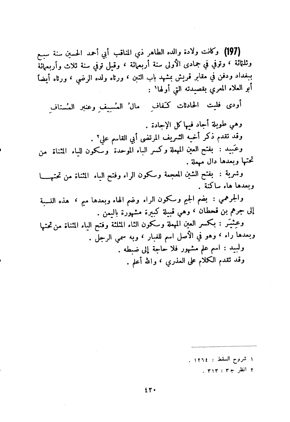(197) وكانت ولادة والدة الطاهرذي المناقب أبي أحمد سنة سبع وثلثمائة، وتوفي في جمادى الأولى سنة أربعمائة، وقيل توفي سنة ثلاث وأربعمائة ببغداد ودفن في مقابر قريش بمشهد باب التبن، ورثاه ولده الرضي، ورثاه أيضا أبو العلاء المعري بقصيدته التي أولها (1) :
