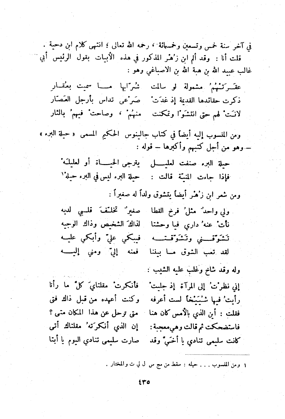 لانت لهم حتى انتشوا وتمكنت ... منهم، وصاحت فيهم بالثار ومن المنسوب إليه أيضا في كتاب جالينوس الحكيم المسمىحيلة البرء - وهو من أجل كتبهم وأكبرها - قوله: