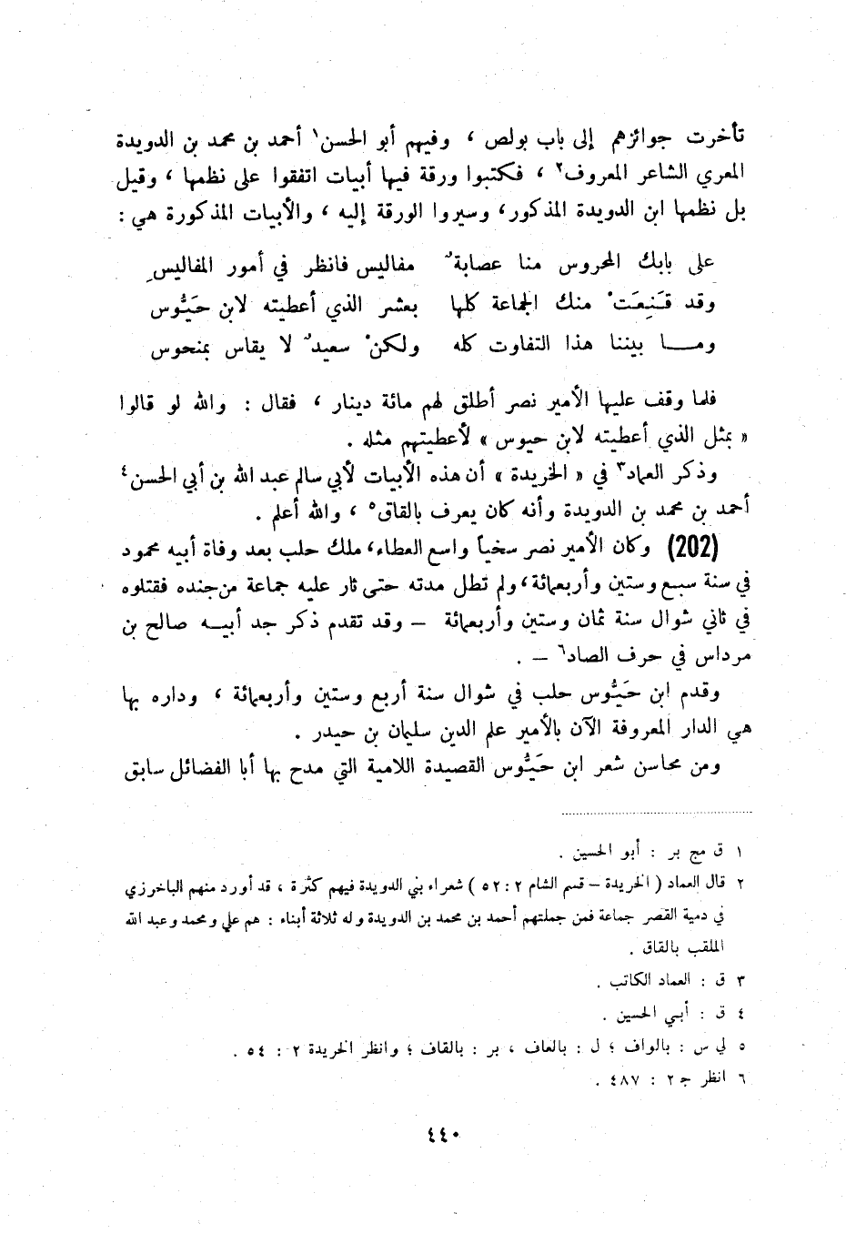 (2) قال العماد (الخريدة - قسم الشام 2: 52) شعراء بني الدويدة فيهم كثرة، قد أورد منهم الباخرزي في دمية القصر جماعة فمن جملتهم أحمد بن محمد بن الدويدة وله ثلاثة أبناء: هم علي ومحمد وعبد الله الملقب بالقاق.