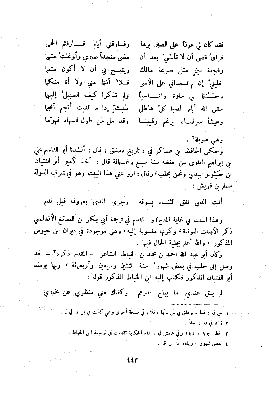 وكان أبو عبد الله أحمد بن محمد بن الخياط الشاعر - المقدم ذكره (3) - قد وصل إلى حلب في بعض شهور (4) سنة اثنتين وسبعين وأربعمائة، وبها يؤمئذ أبو الفتيان المذكور فكتب إليه ابن الخياط المذكور قوله: