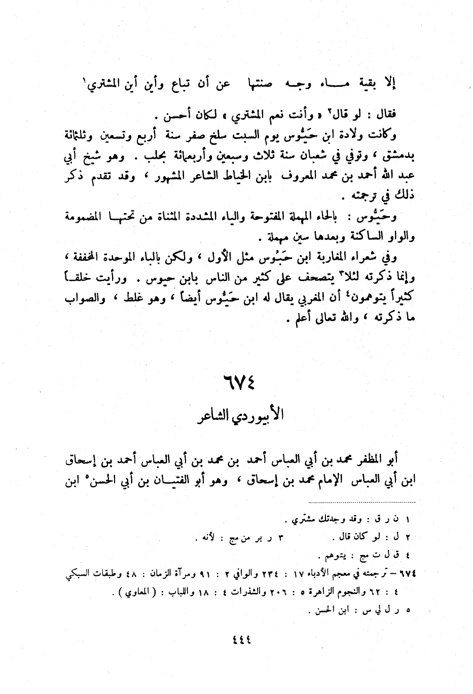 وفي شعراء المغاربة ابن حبوس مثل الأول، ولكن بالباء الموحدة المخففة، وإنما ذكرته لئلا (3) يتصحف على كثير من الناس بابن حيوس. ورأيت خلقا كثيرا يتوهمون (4) أن المغربي يقال له ابن حيوس ايضا، وهو غلط، والصواب ما ذكرته، والله تعالى أعلم.